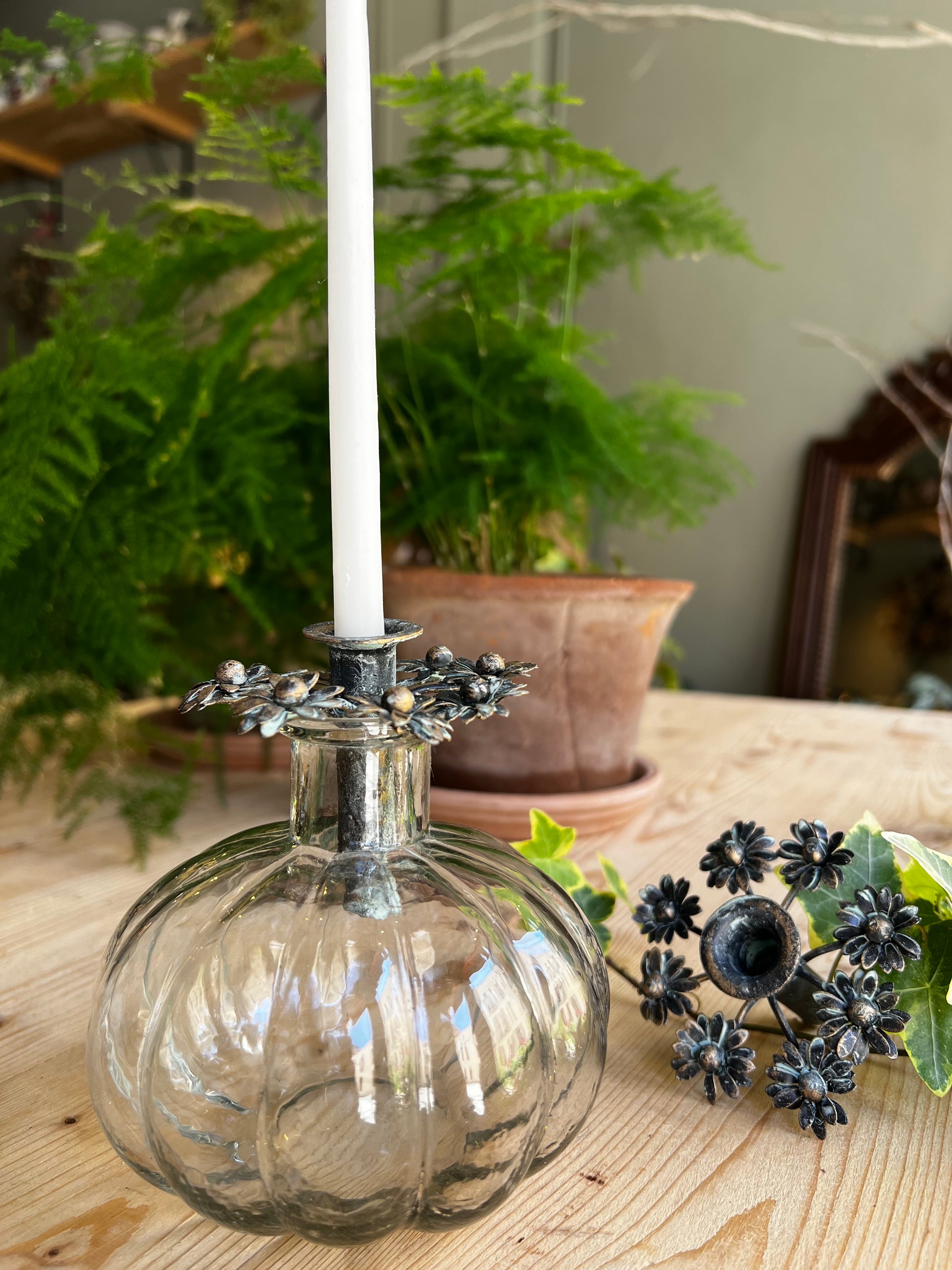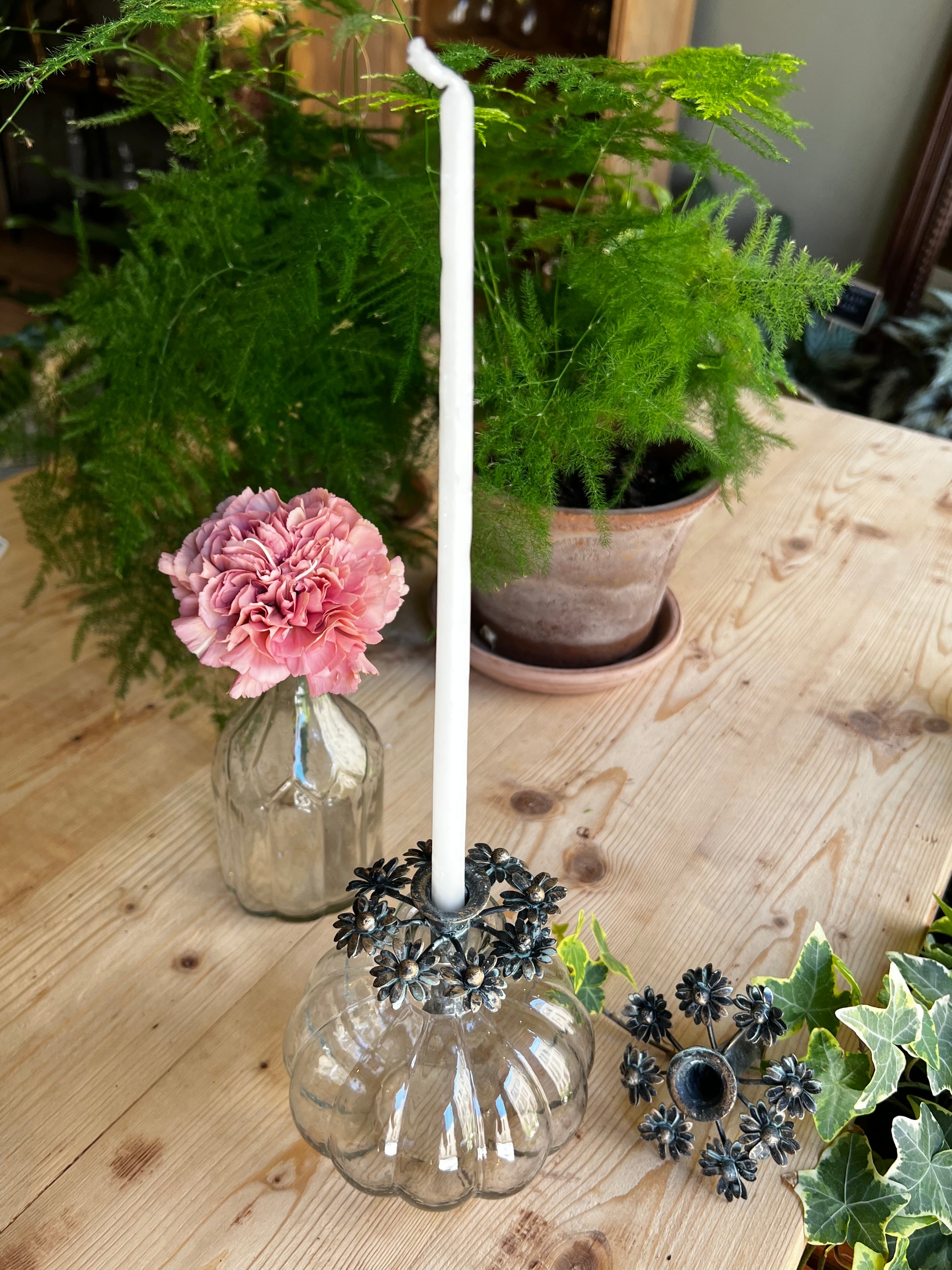 Soporte de metal que se ajusta a las bocas estrechas de jarroncitos o botellas, quedando una vela muy original y elegante para vestir cualquier mesa o rincón.