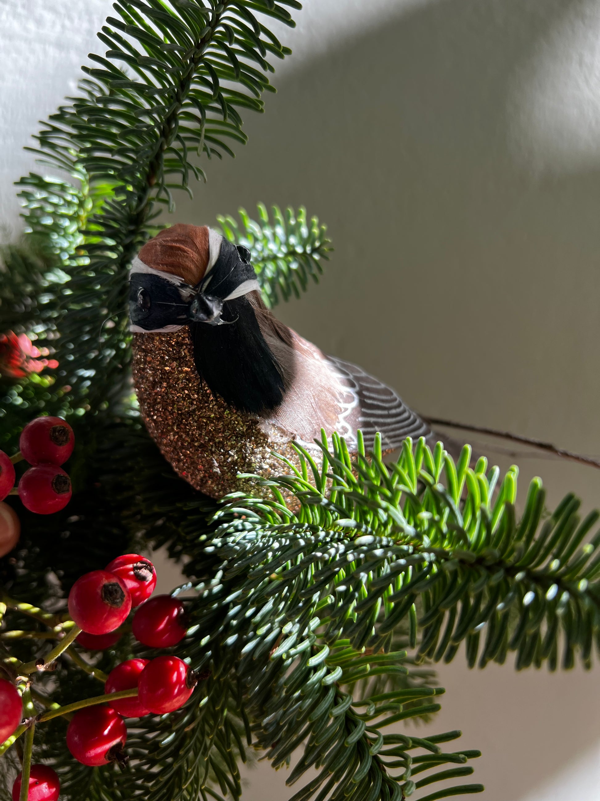 Adorno decorativo en forma de pajarito con detalle brillante en la barriga y plumas artificiales. Nos gusta la autenticidad de este ornamento y lo fácil que resulta colocarlo gracias a la pinza que tiene a modo de "patitas"