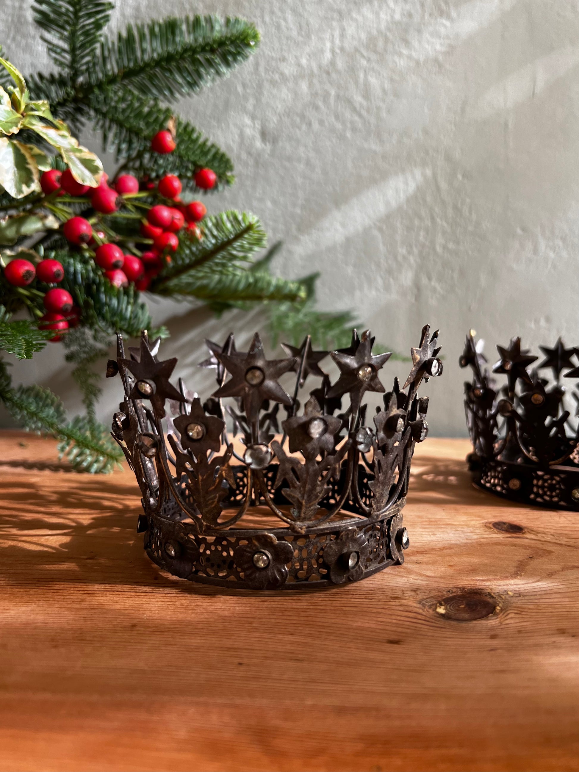 Portavelas decorativo en forma de corona. De metal labrado, en tono bronce antiguo con cristalitos incrustados. No incluye vela.