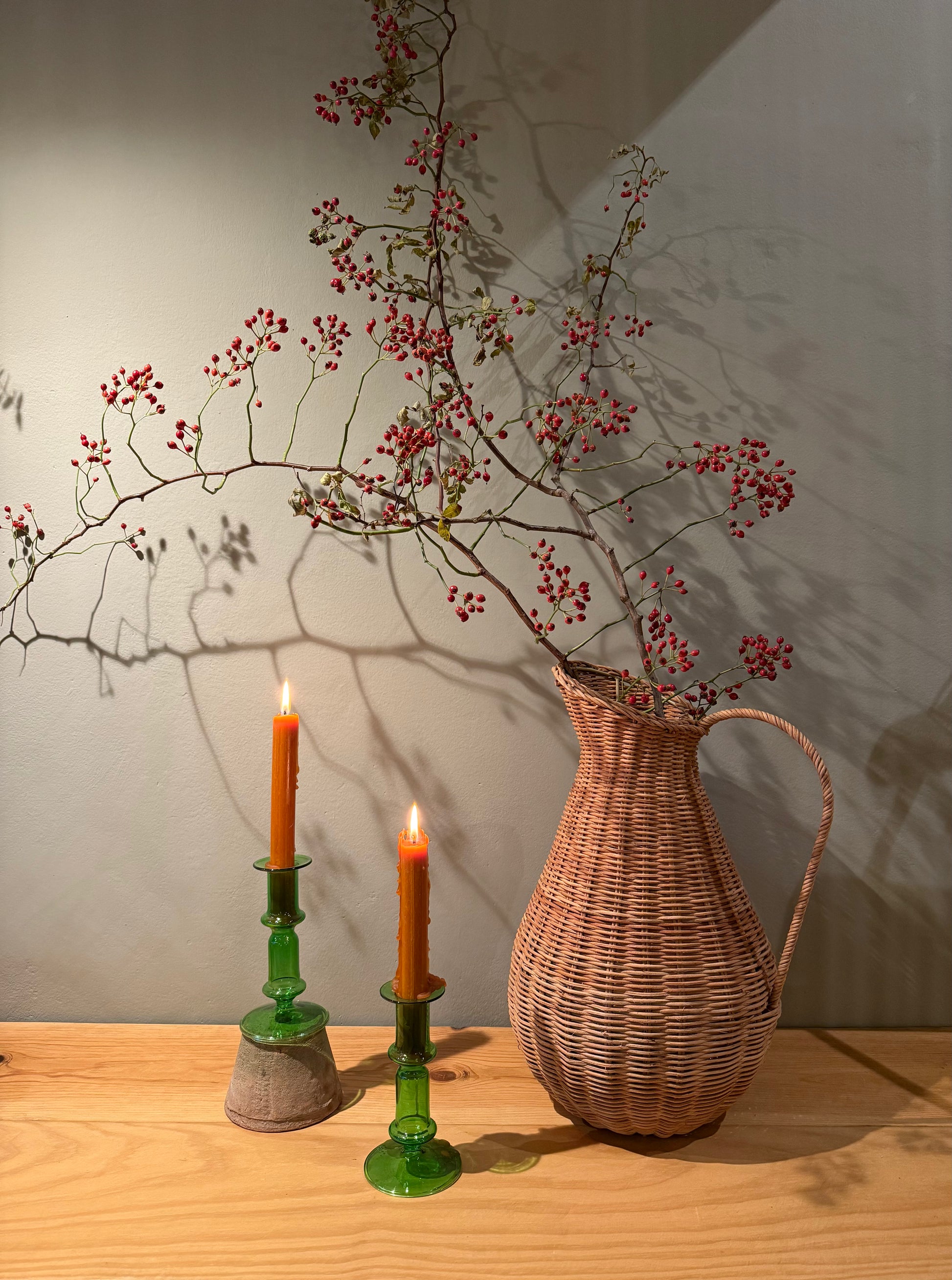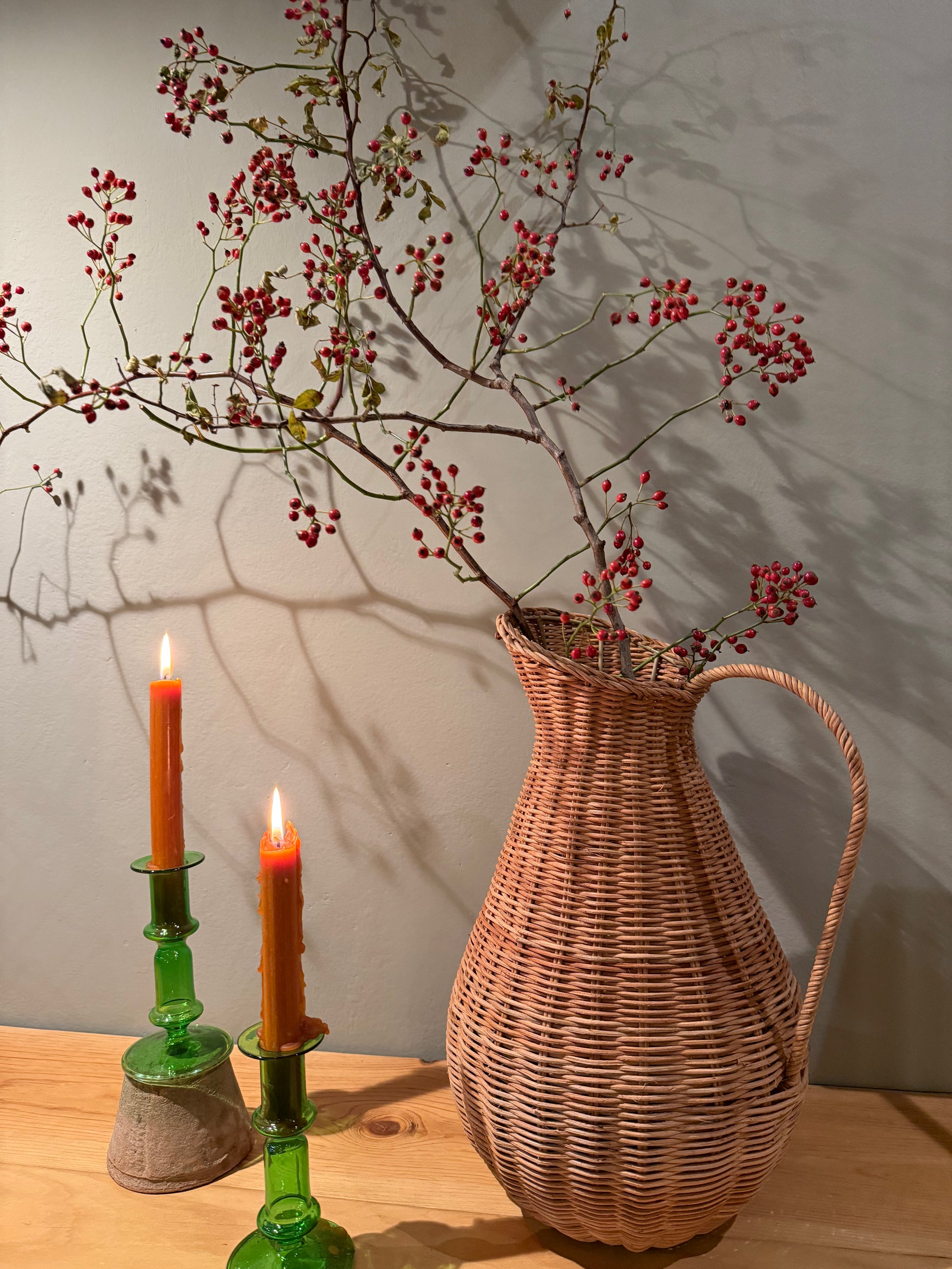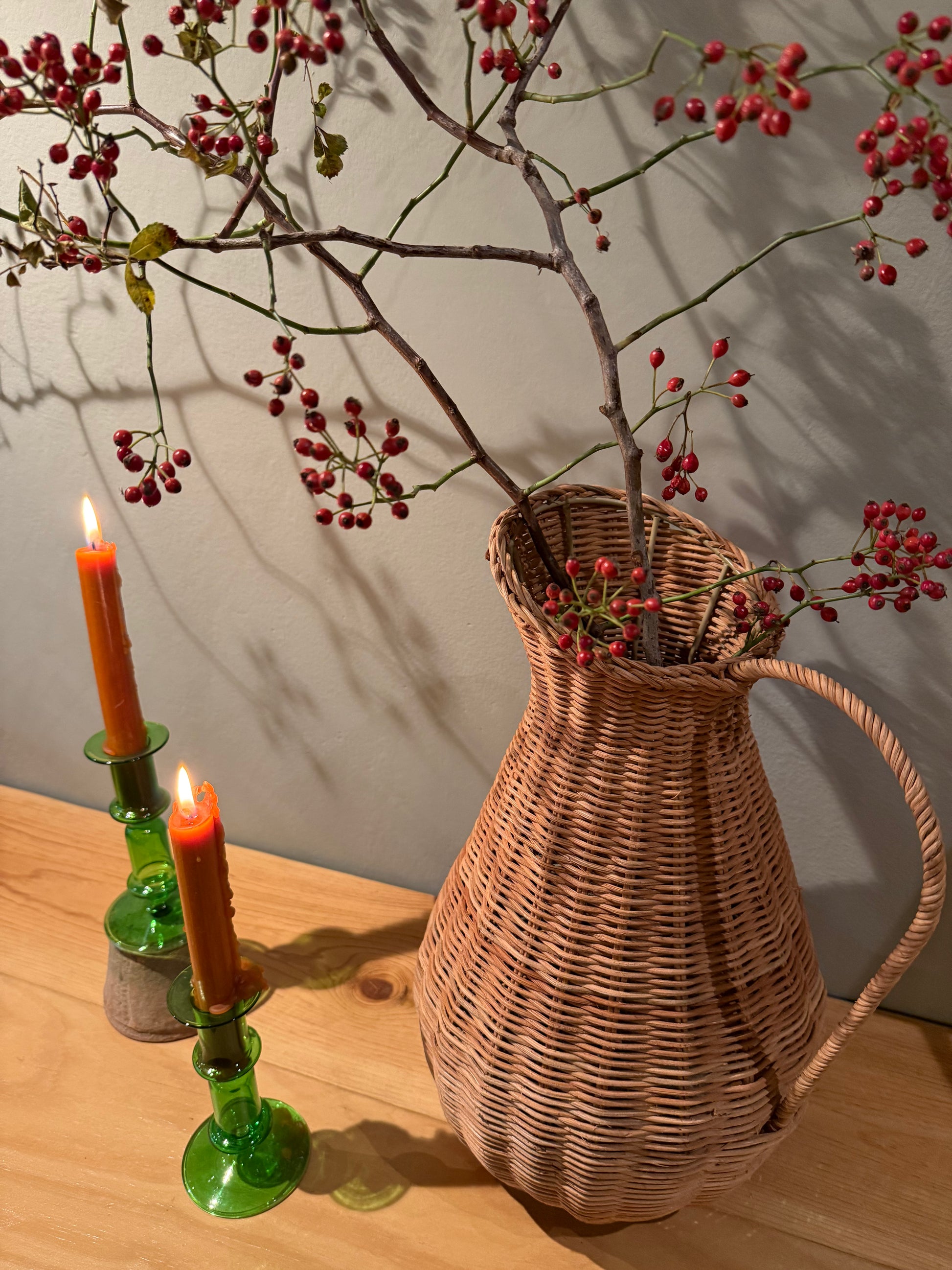 Jarra decorativa de yute artesanal. Queda muy elegante en algún rincón especial. Nos gusta mucho decorarla poniendo un jarrón estrecho dentro con ramas o flores.