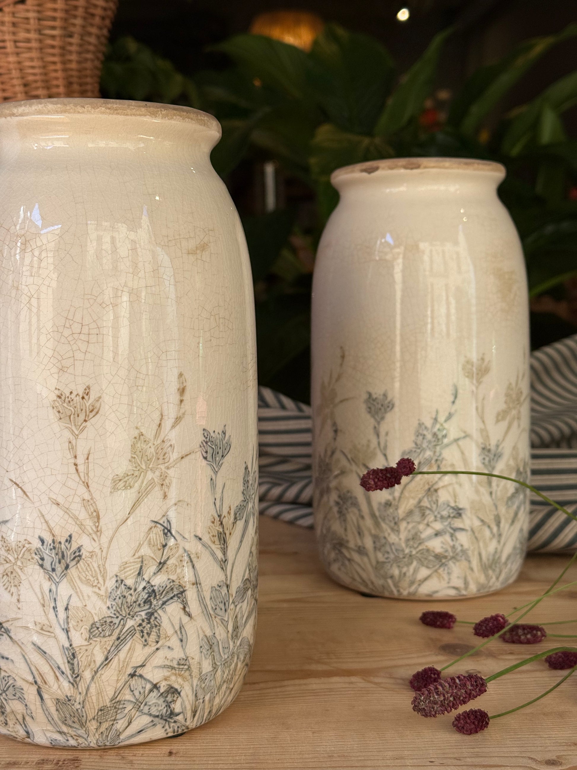 Jarrón de cerámica en tonos blanco roto con un bonito estampado de flores . Su diseño clásico y sencillo lo hace perfecto para decorar cualquier espacio.