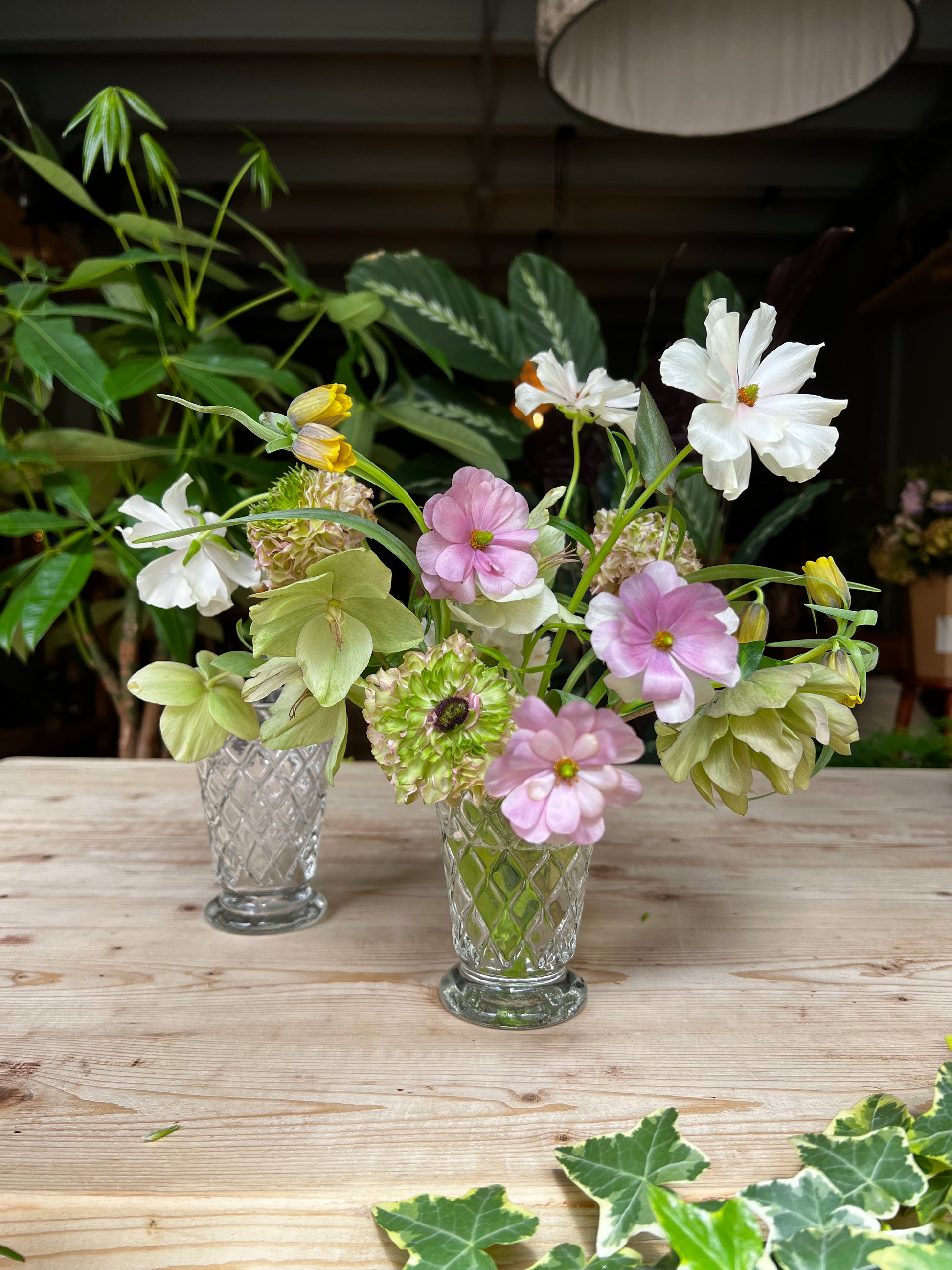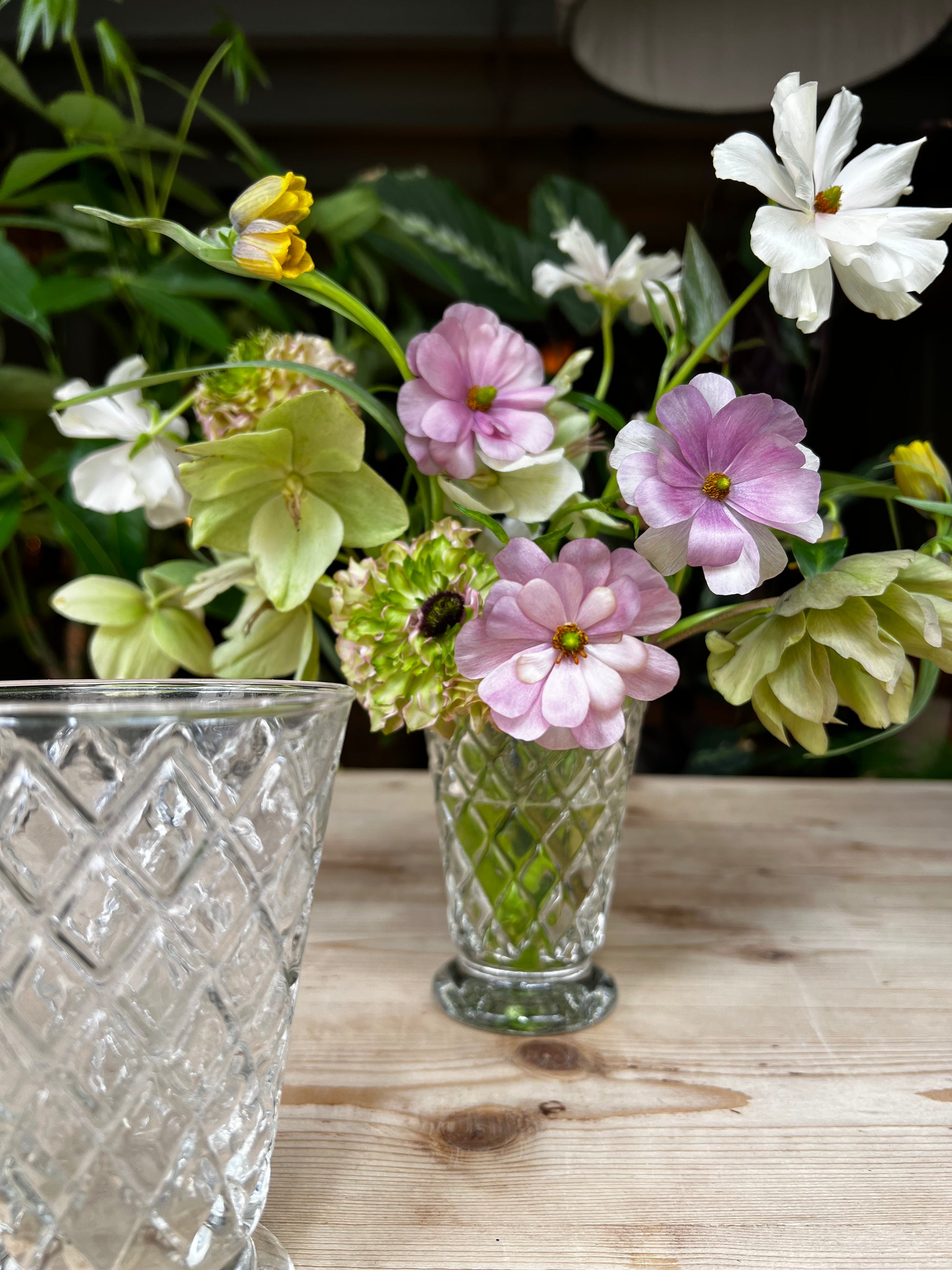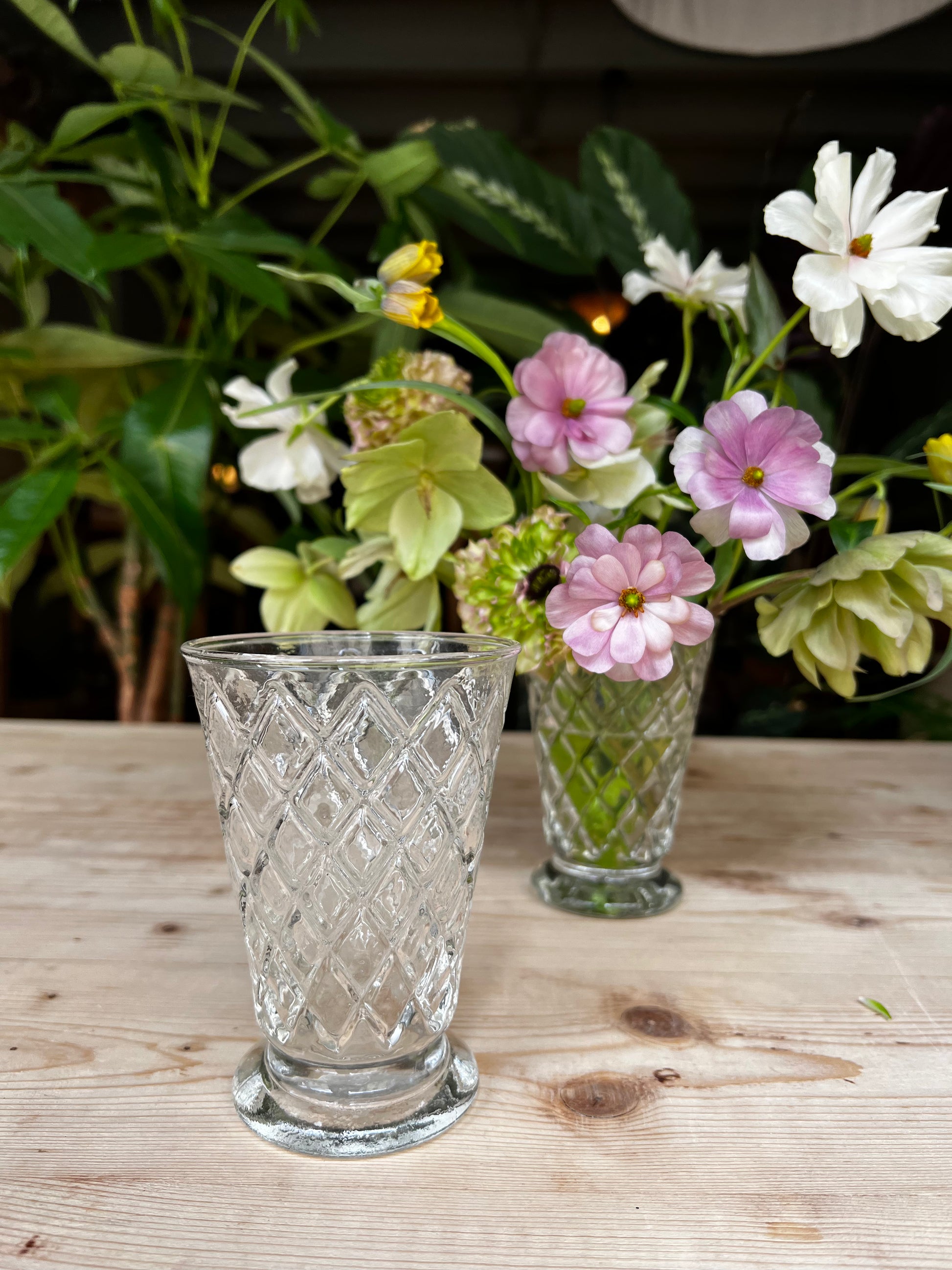 Jarroncito de vidrio prensado con boca ancha que permite introducir varias flores. Es un fondo de armario muy bueno para hacer composiciones con otros de nuestros jarroncitos y decorarar una mesa.