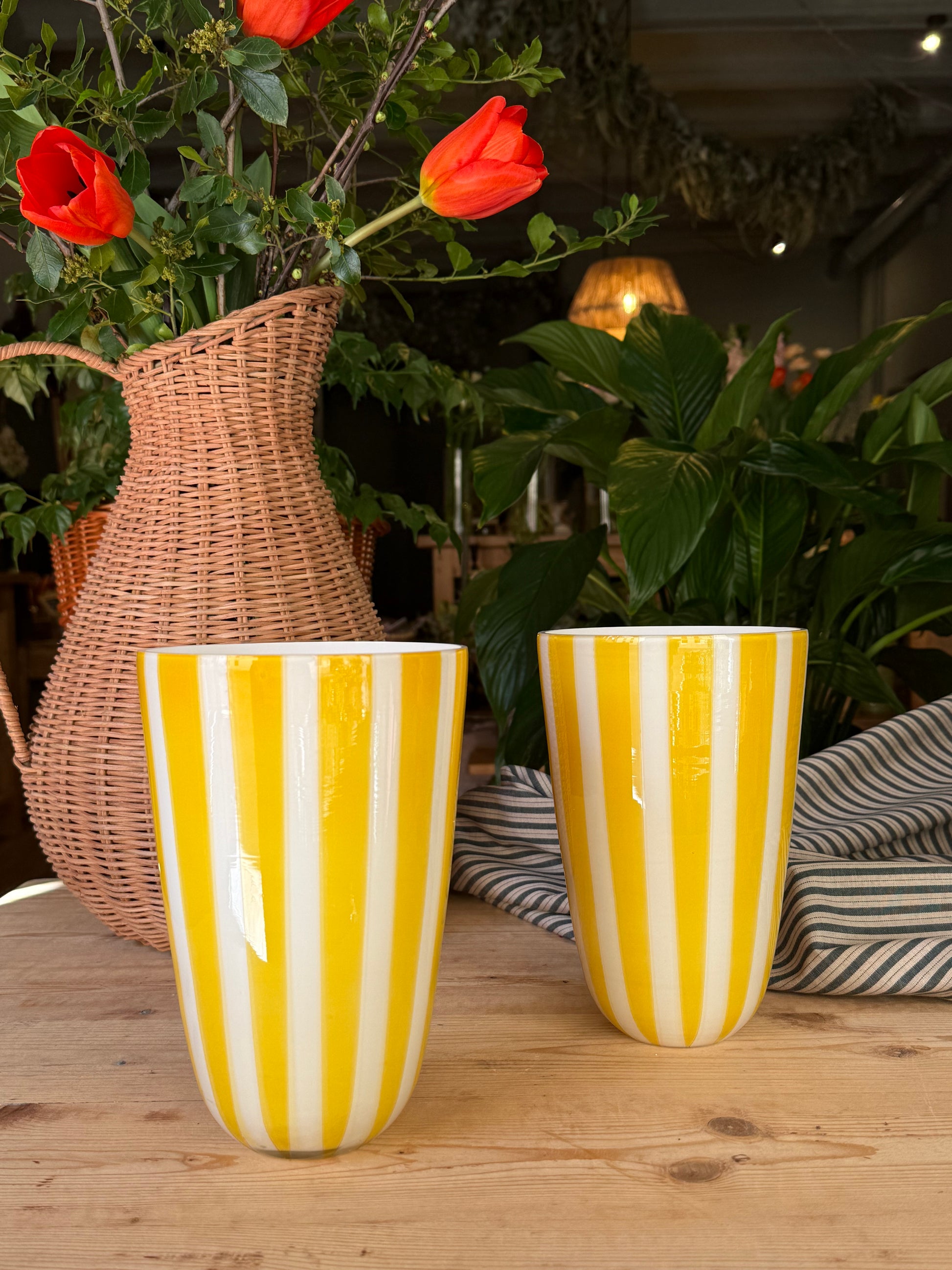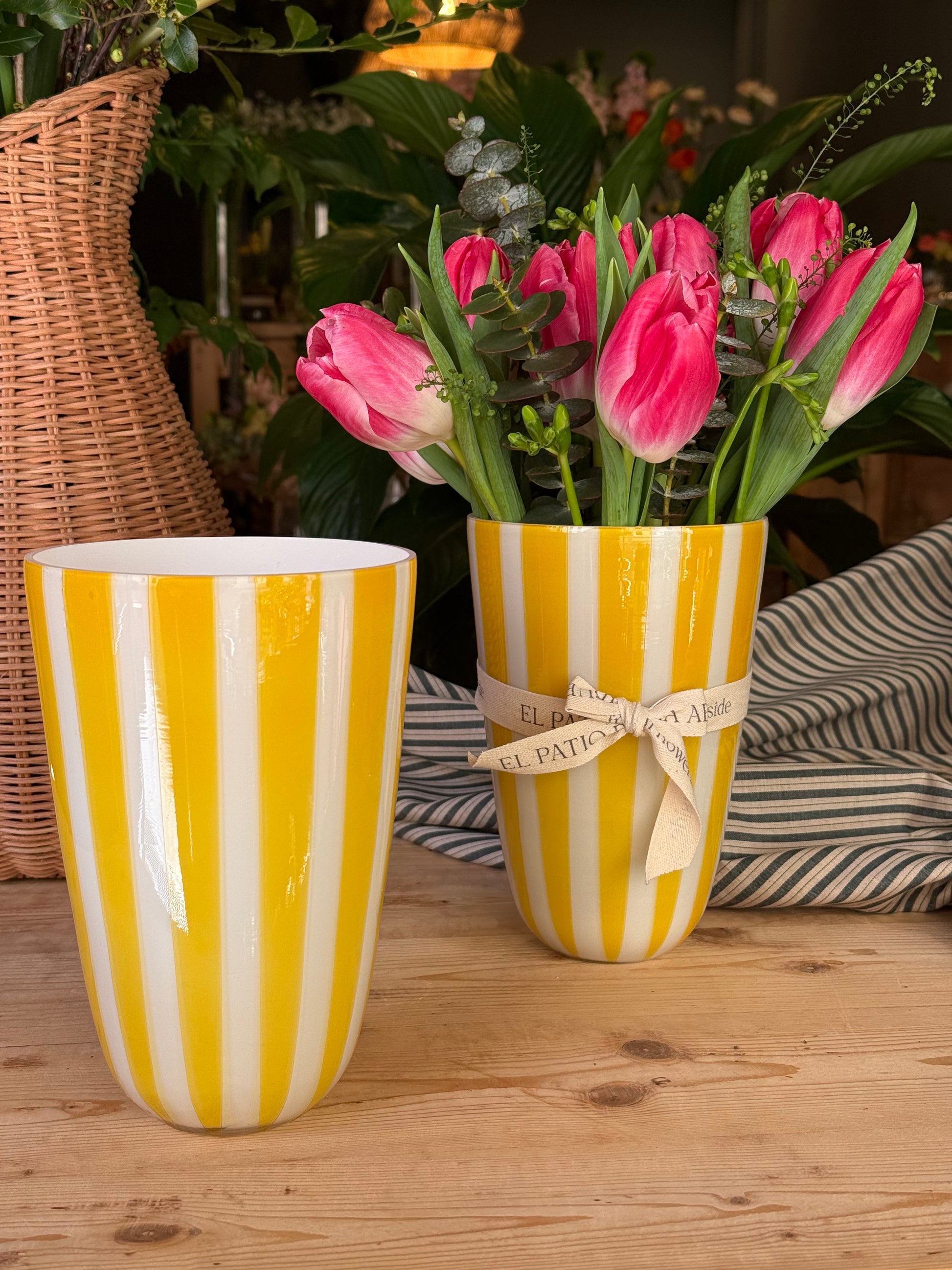 Jarrón de cristal con diseño de rayas en color amarillo. Elegante y alegre para poner flores o decorar una estantería.