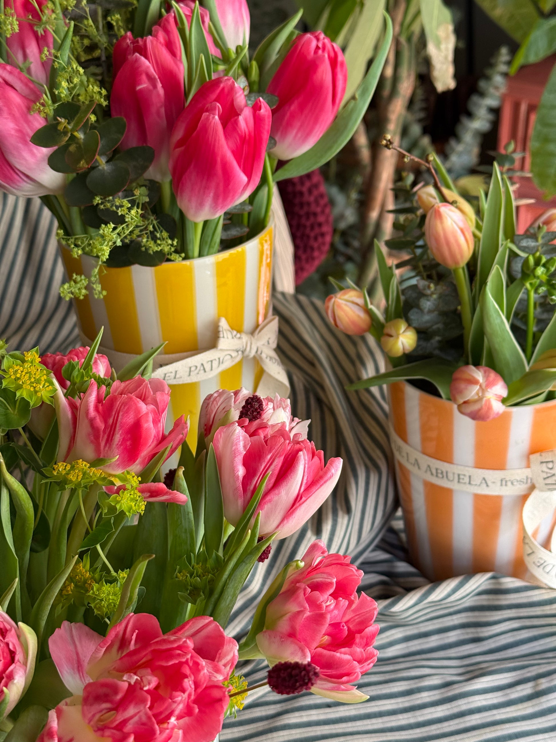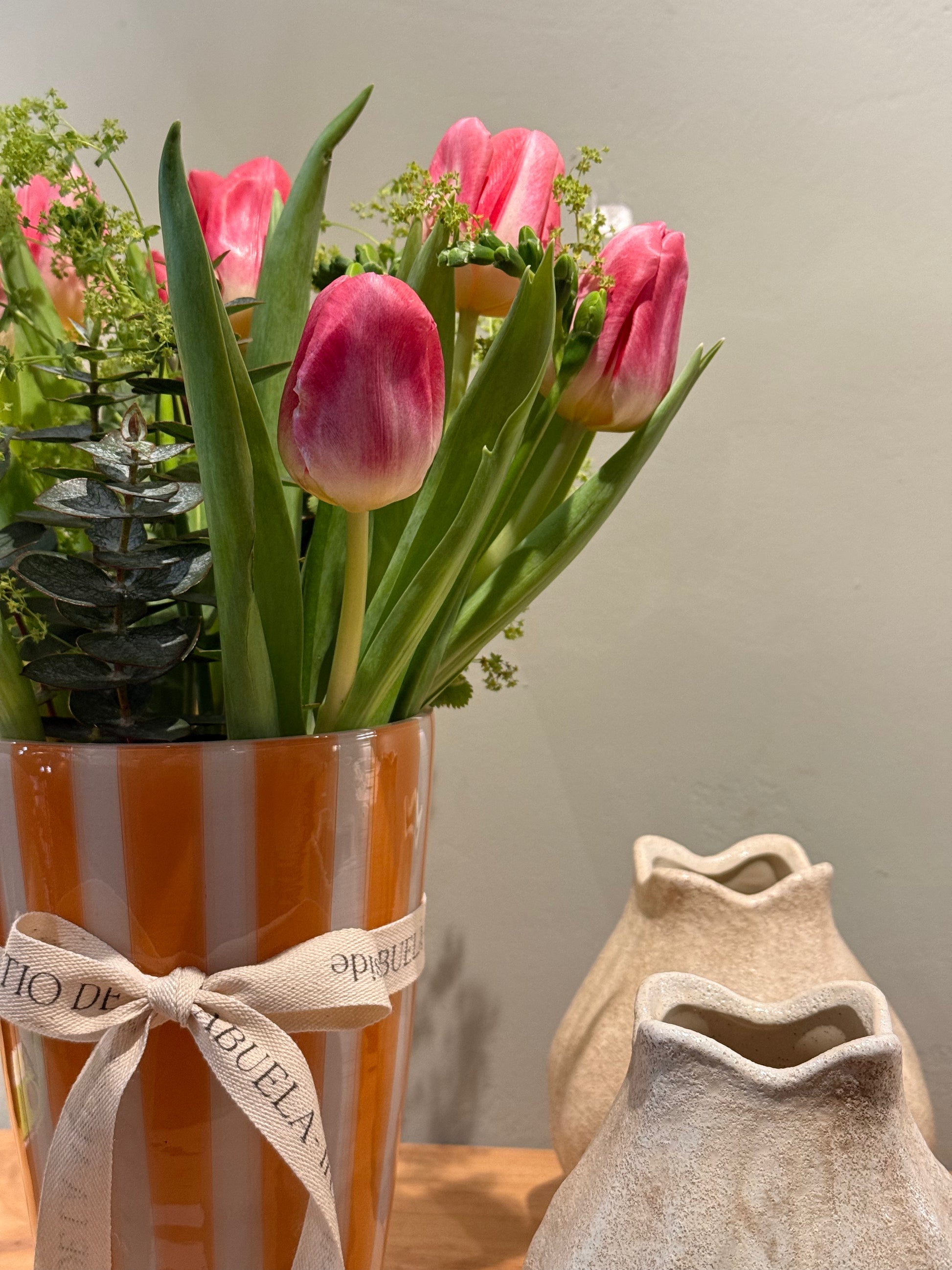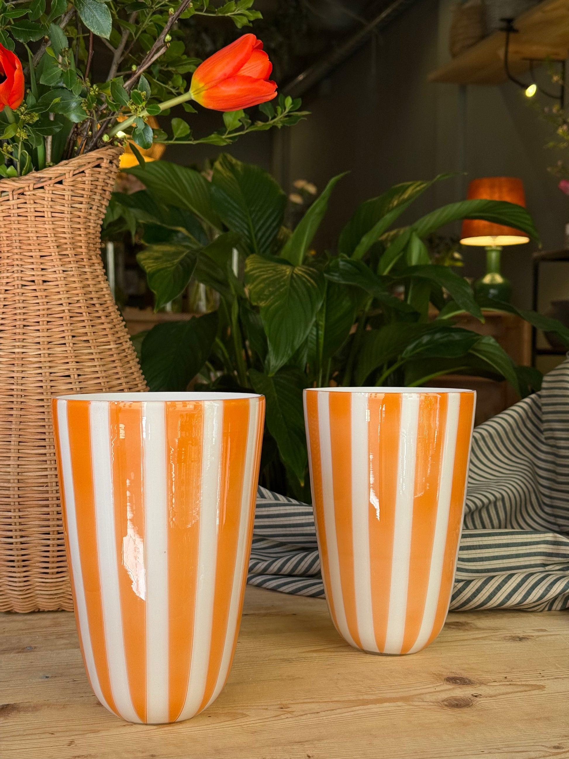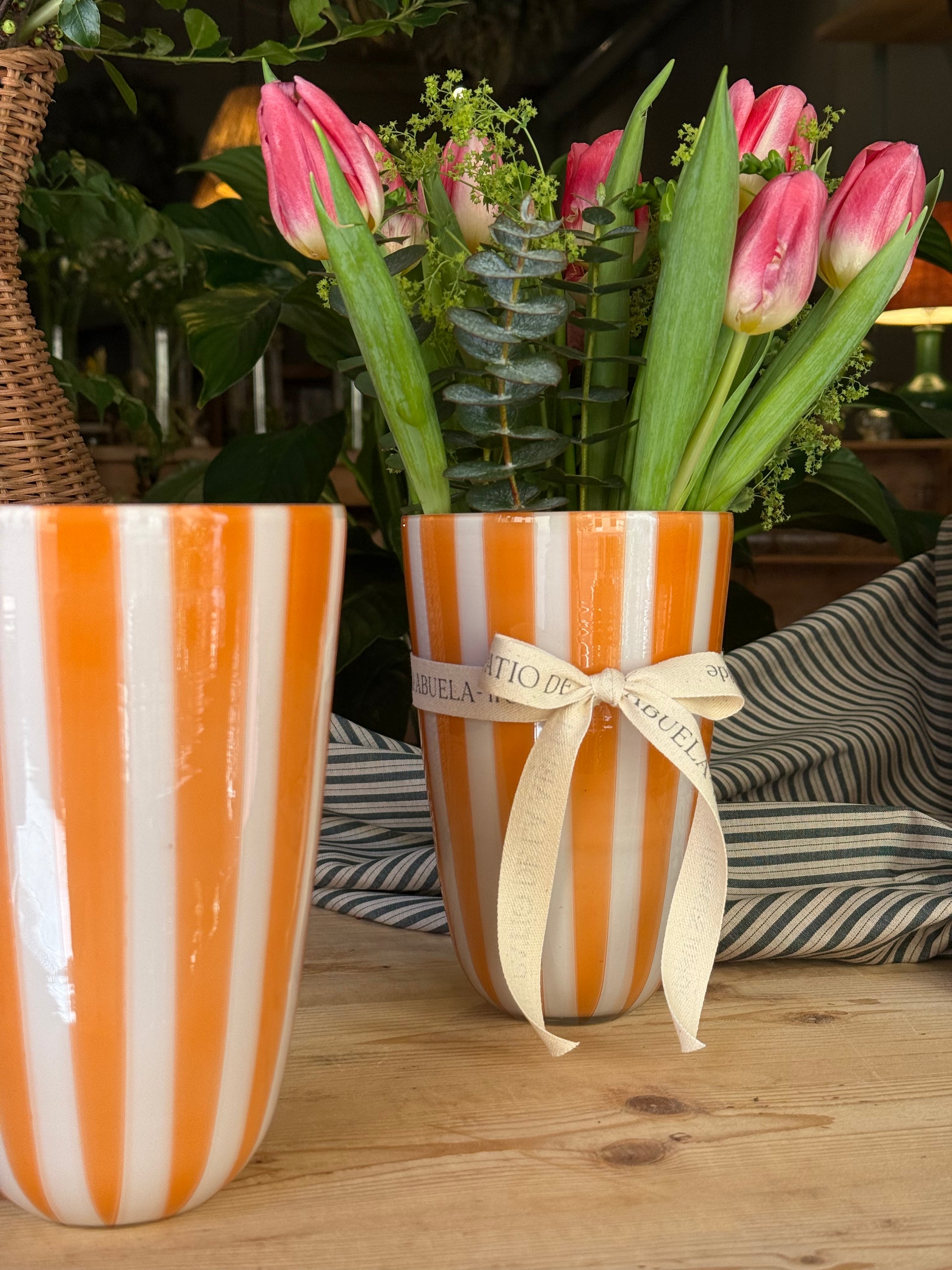 Jarrón de cristal con diseño de rayas en color melocotón. Elegante y alegre para poner flores o decorar una estantería.