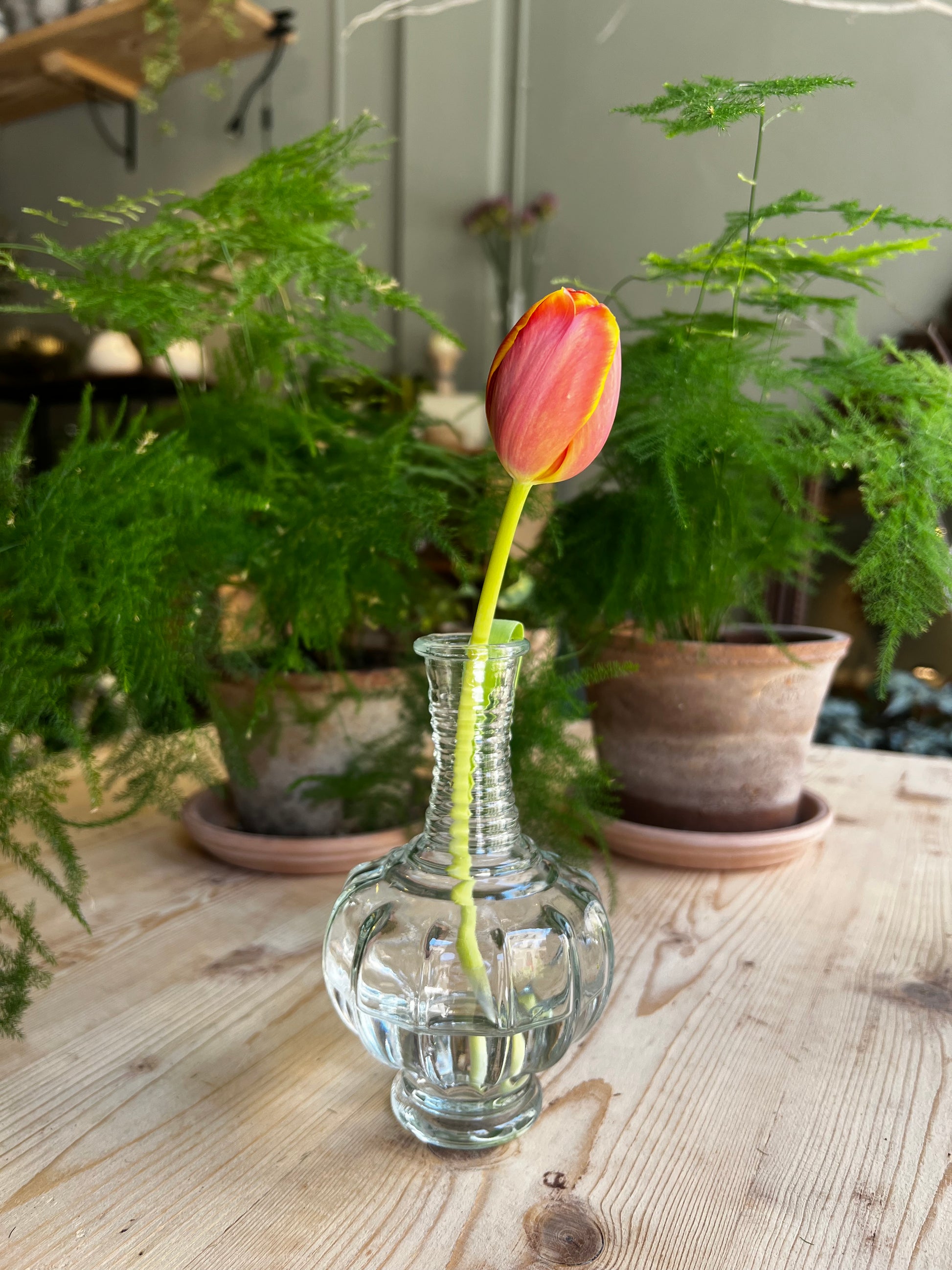 Jarróncito de cristal prensado, de cuello largo, ideal para poner mesas o decorar rincones, combinándolo con nuestra colección de jarroncitos