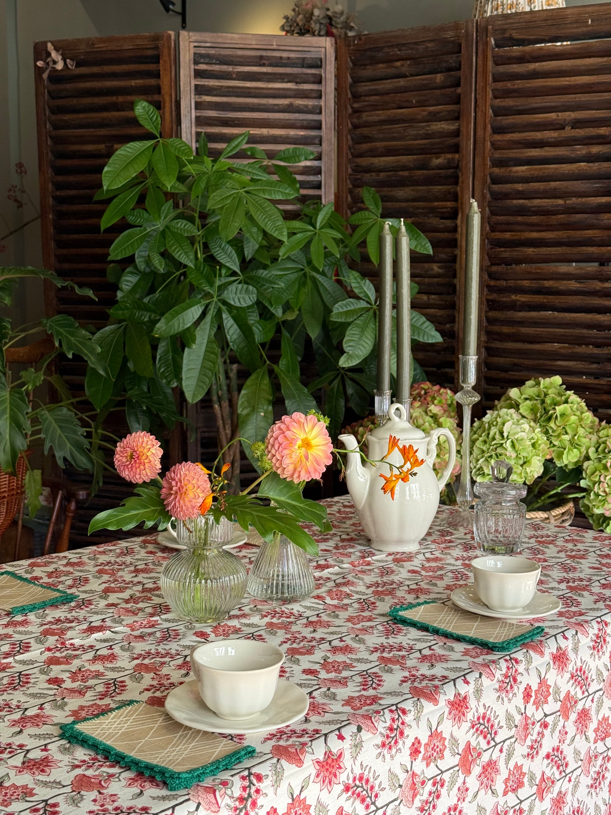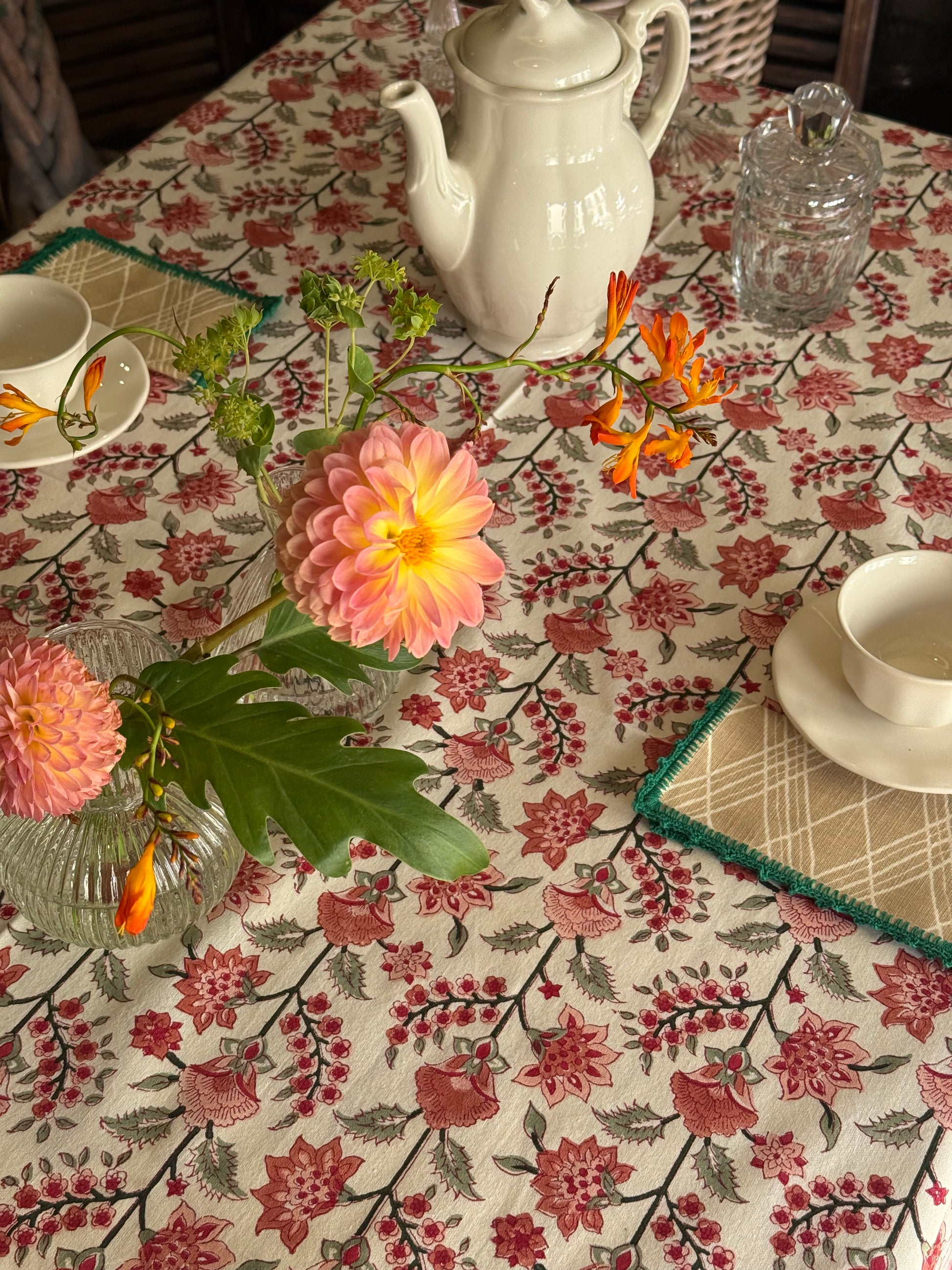 Mantel de algodón 100%, estampado floral utilizando el tradicional método indio “blockprint”.