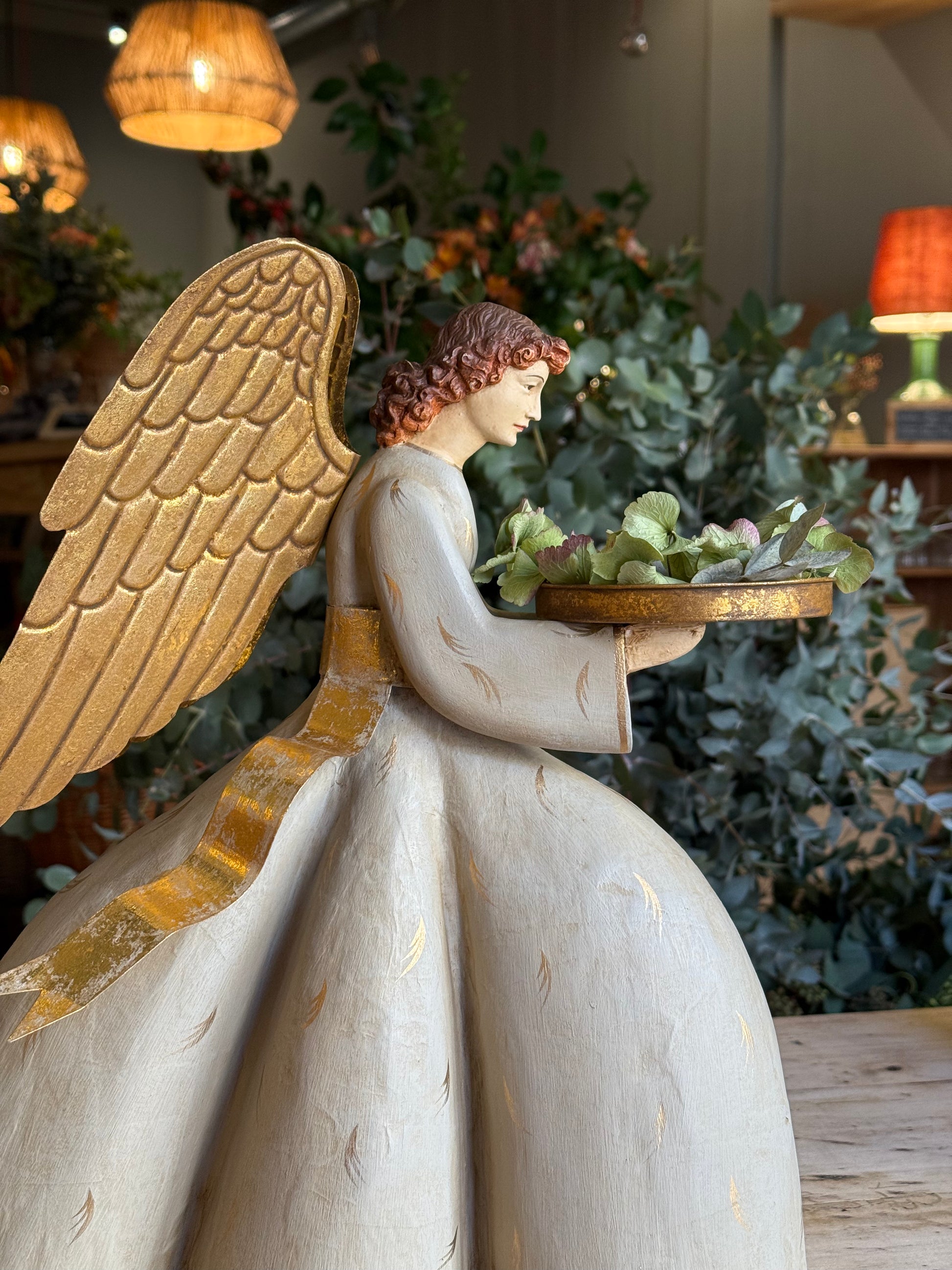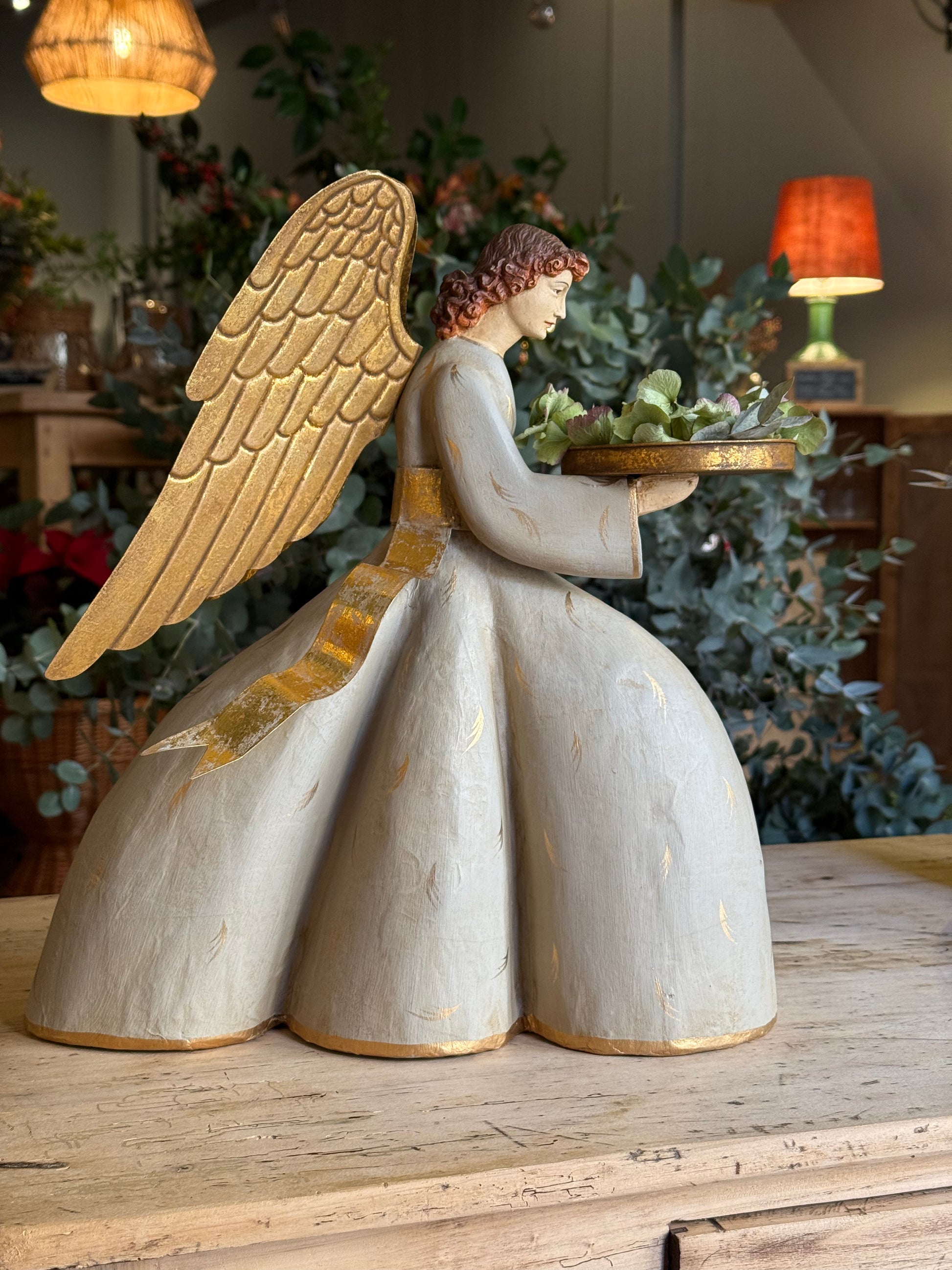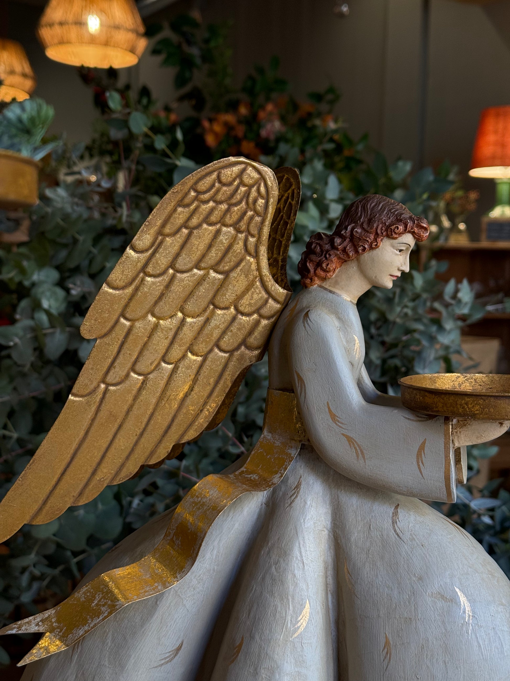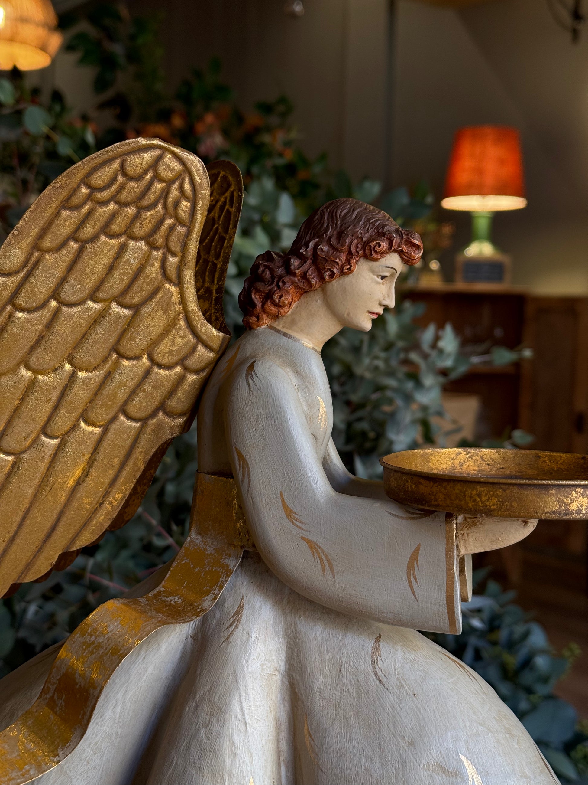 Ángel porta vela, agachado y de tamaño grande. Hecho de papel maché, resina y metal dorado, es realmente elegante y muy bonito. Nos gusta conjuntarlo con el otro modelo, que está de pie.