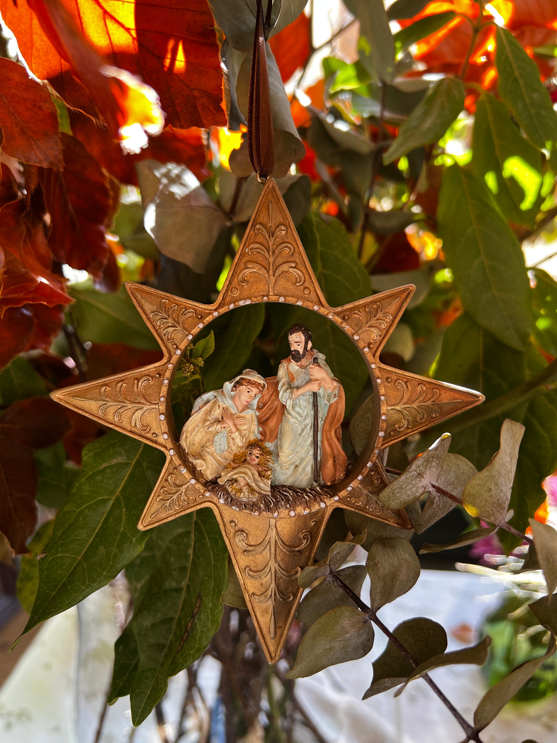 Ornamento de madera pintado a mano, en forma de estrella con la Sagrada Familia. Ideal para decorar y colgar donde más te guste. Ideal combinarla con el resto de nuestros adornos para el árbol.