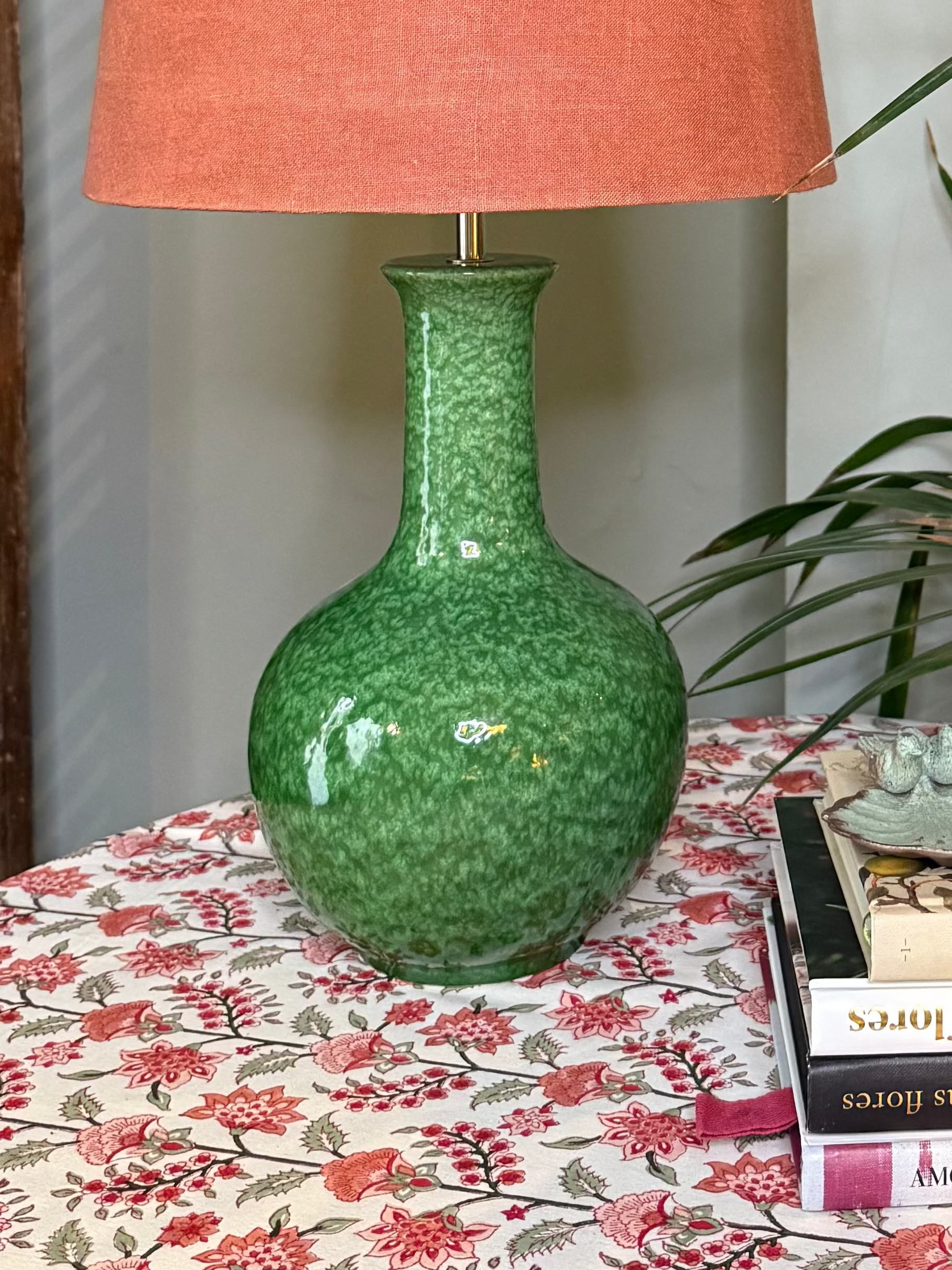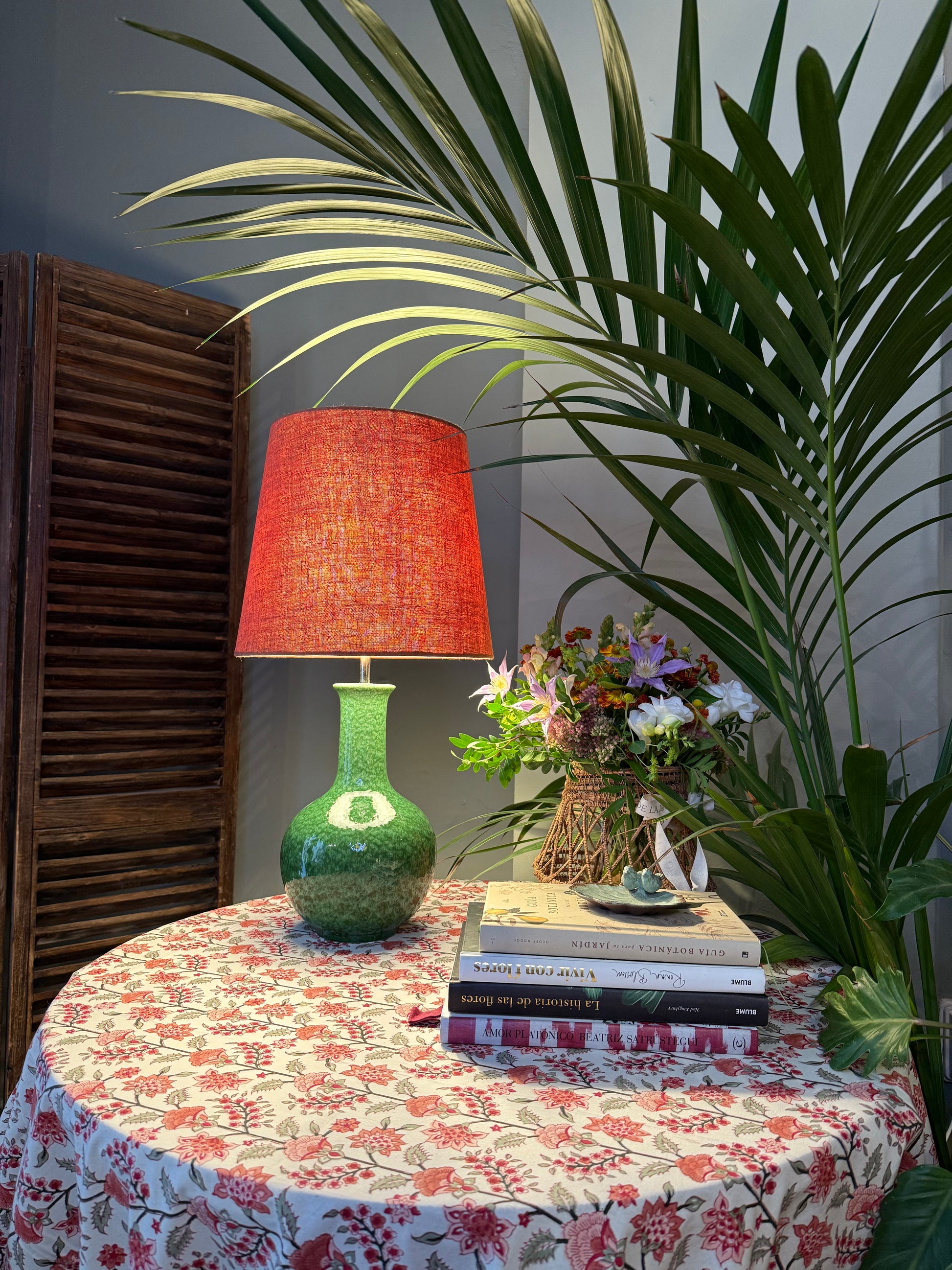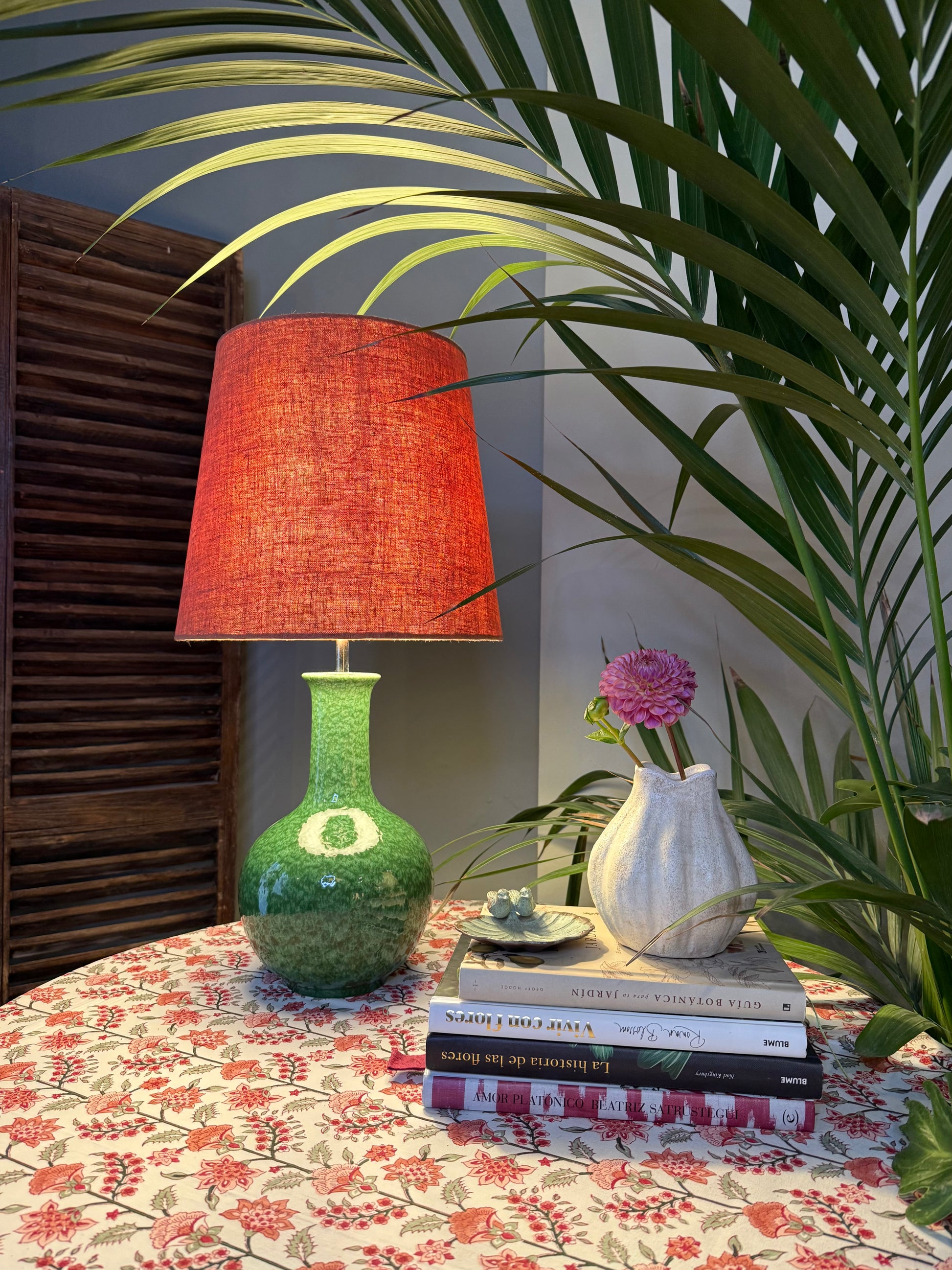 Pantalla de lino en color teja. Ideal para combinar con nuestras lámparas de cerámica esmaltadas. Proyecta una luz cálida y acogedora, que a la vez alegra un despacho, un rincón del salón, una mesita de noche o espacios de lectura.