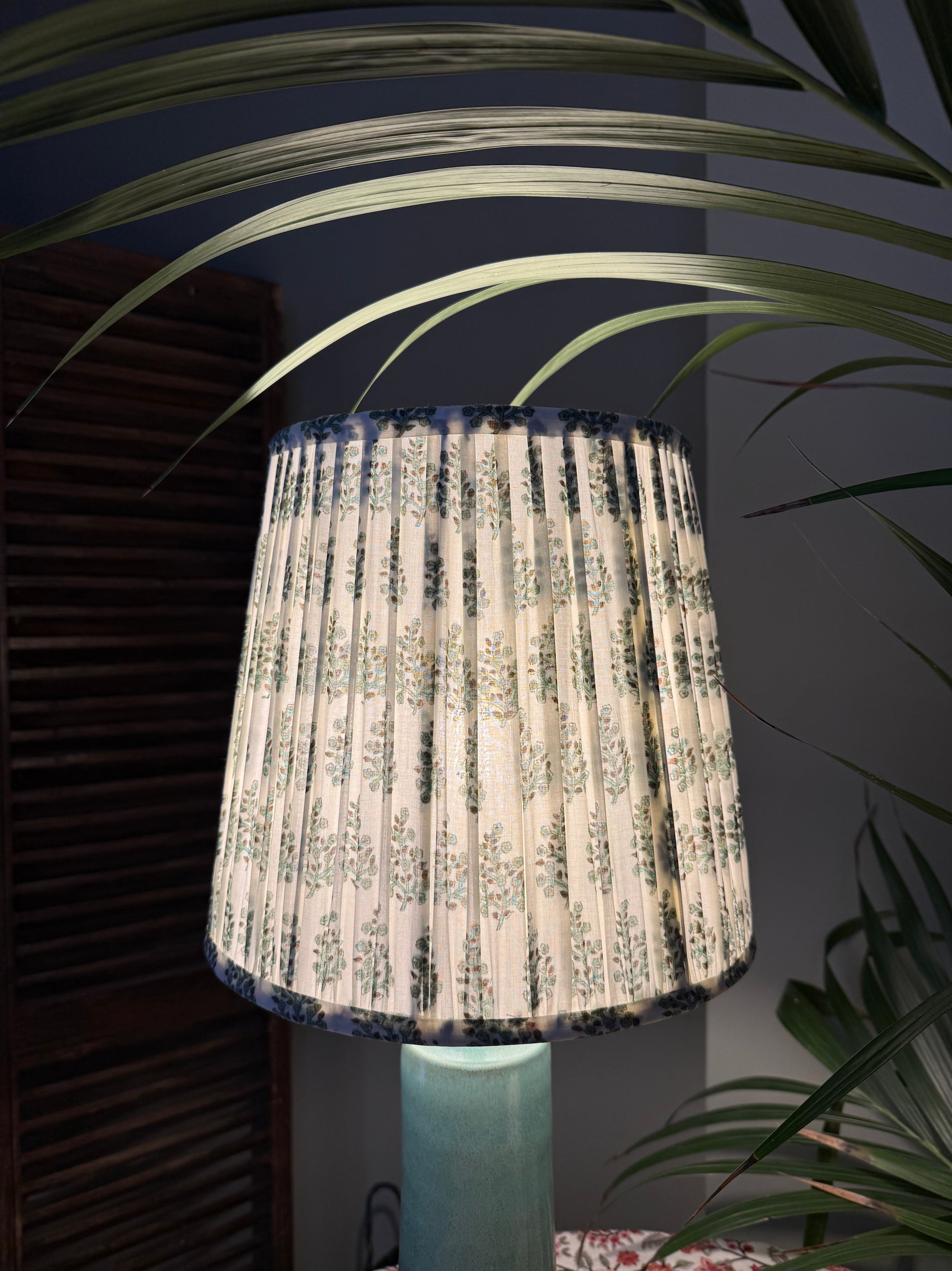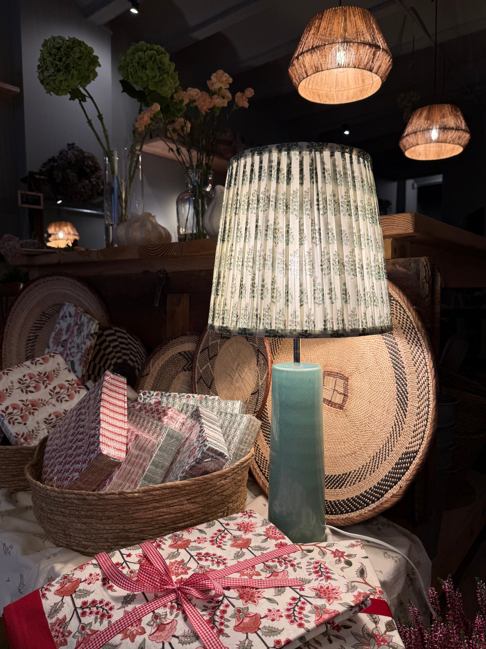 Pantalla de tela plisada, con diseño de flores en tonos verde agua. Ideal para combinar con nuestras lámparas de cerámica esmaltadas. Proyecta una luz cálida y acogedora, que a la vez alegra un despacho, un rincón del salón, una mesita de noche o espacios de lectura.