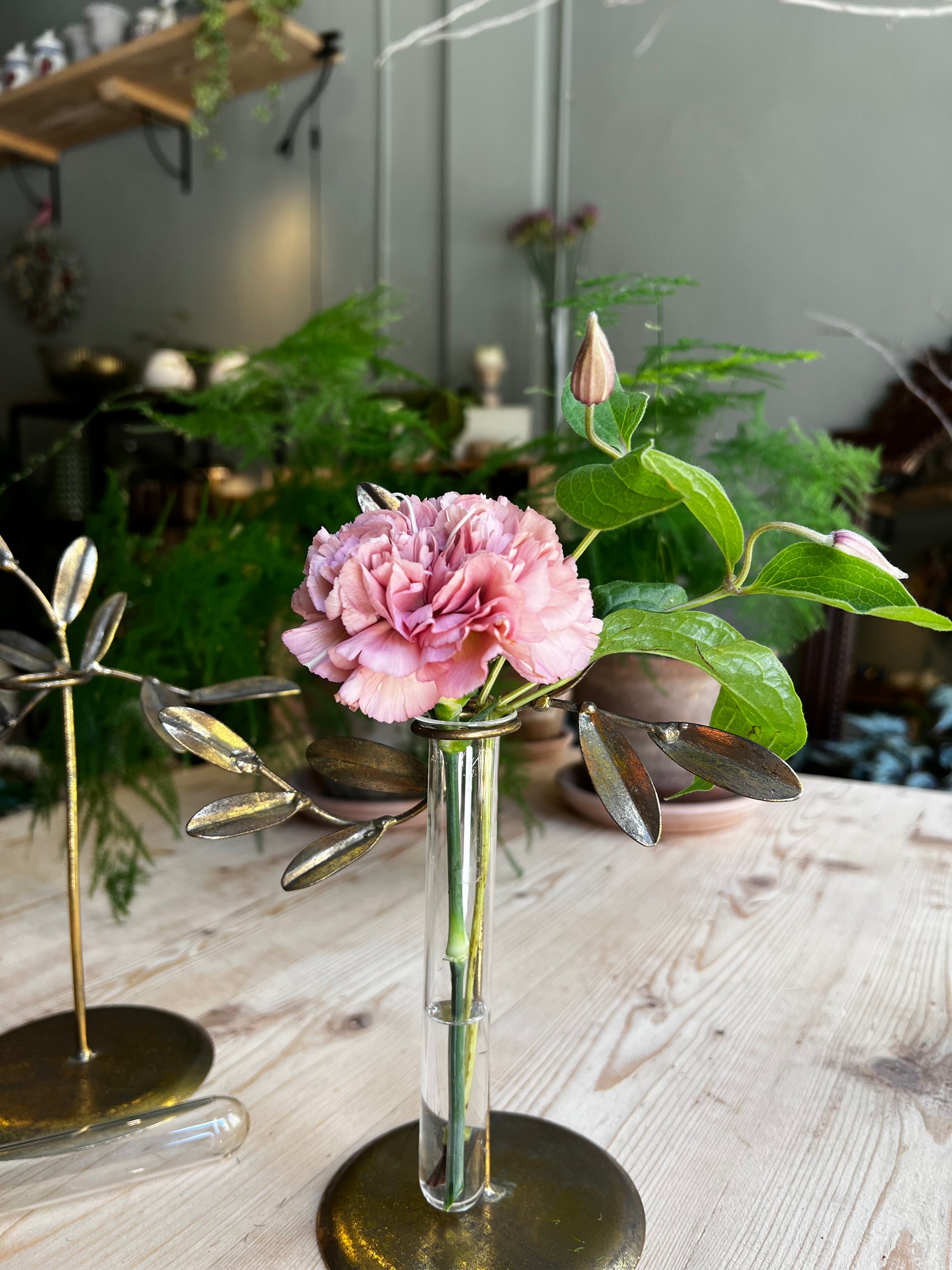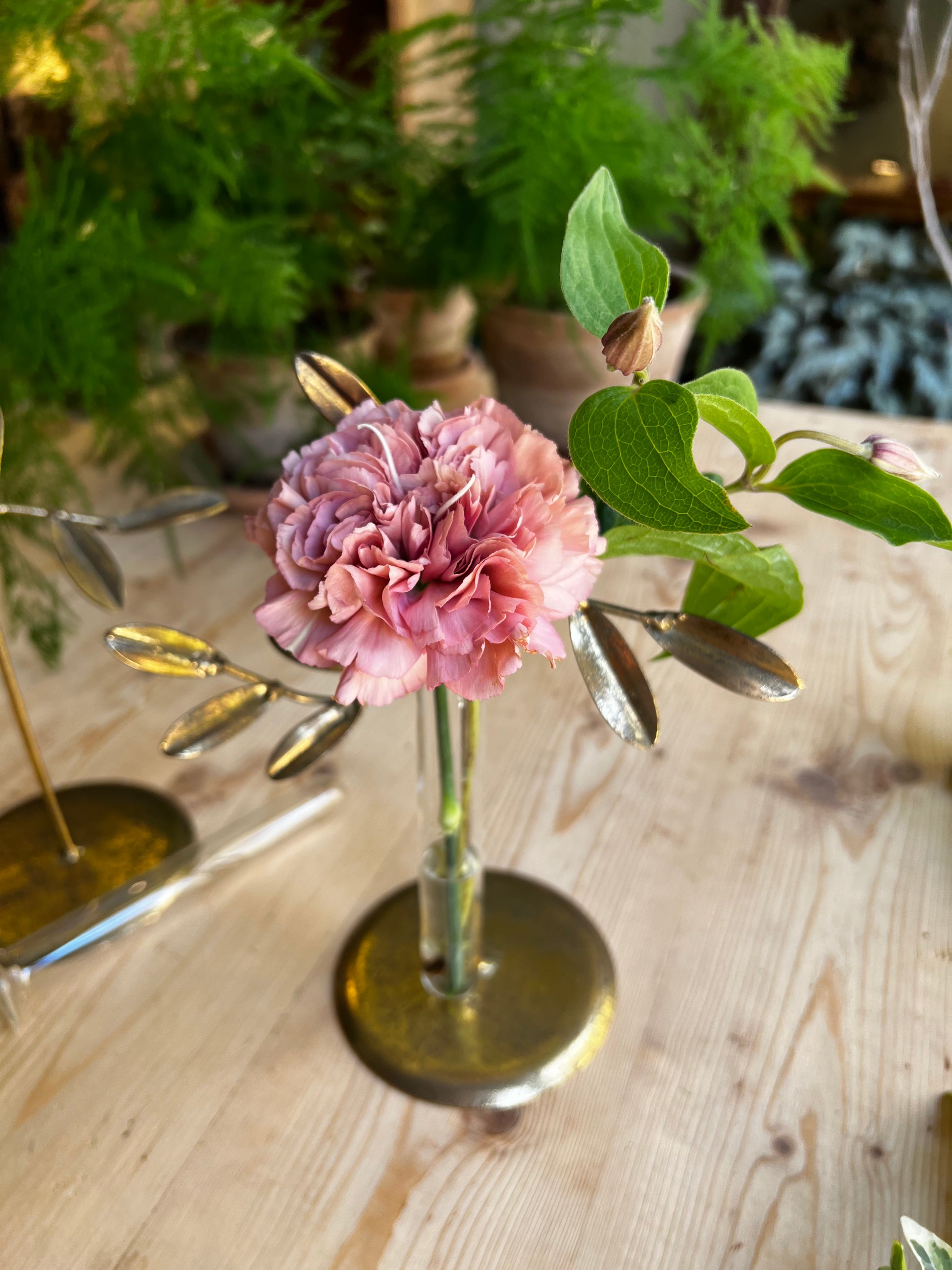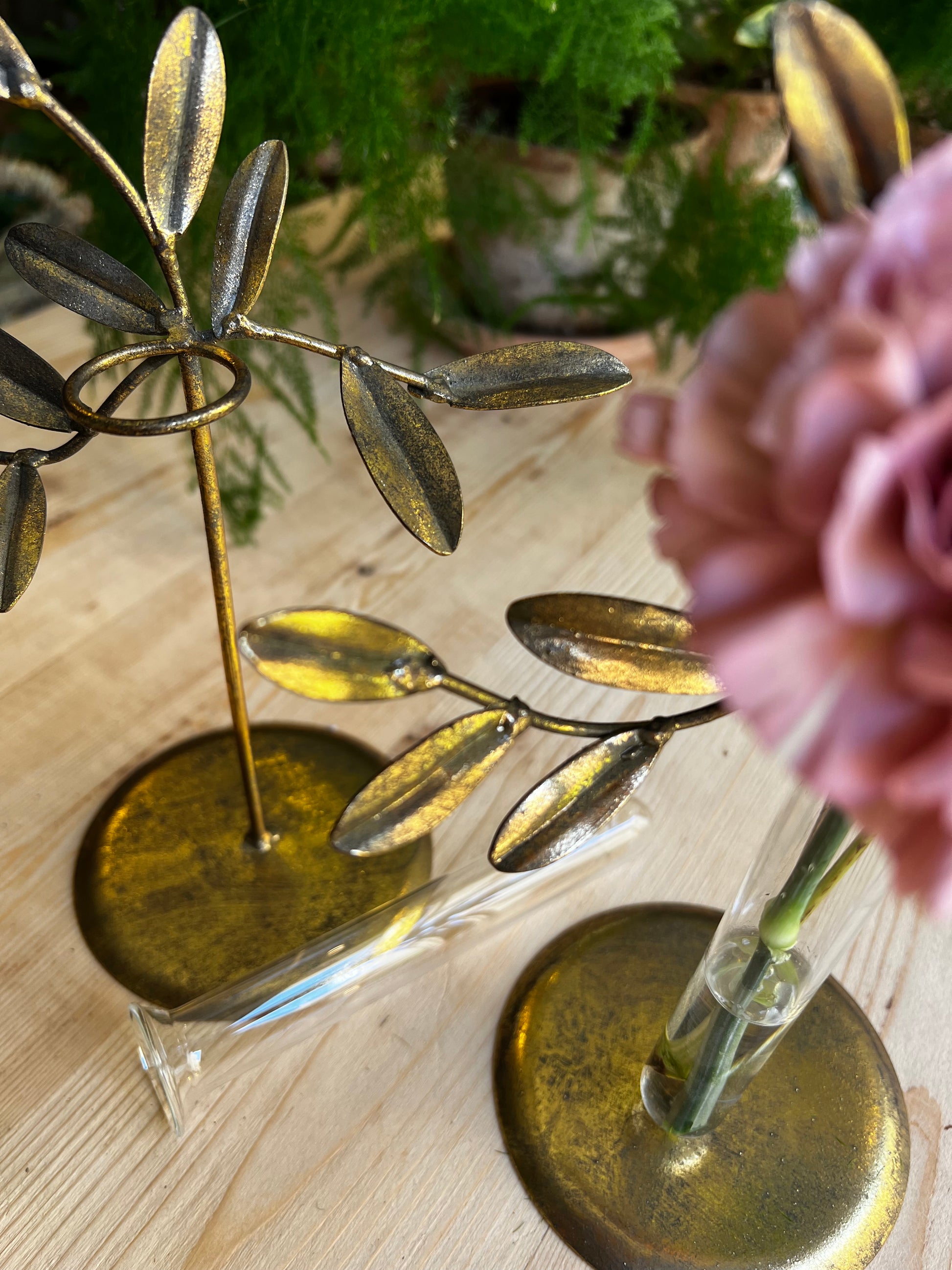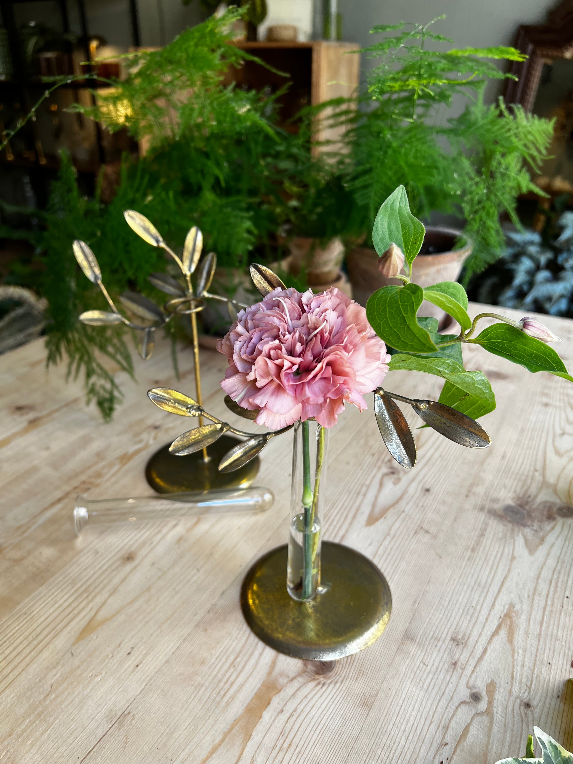 Portaflores de dos piezas, soporte de latón envejecido y pipeta de cristal, para poner una o dos flores