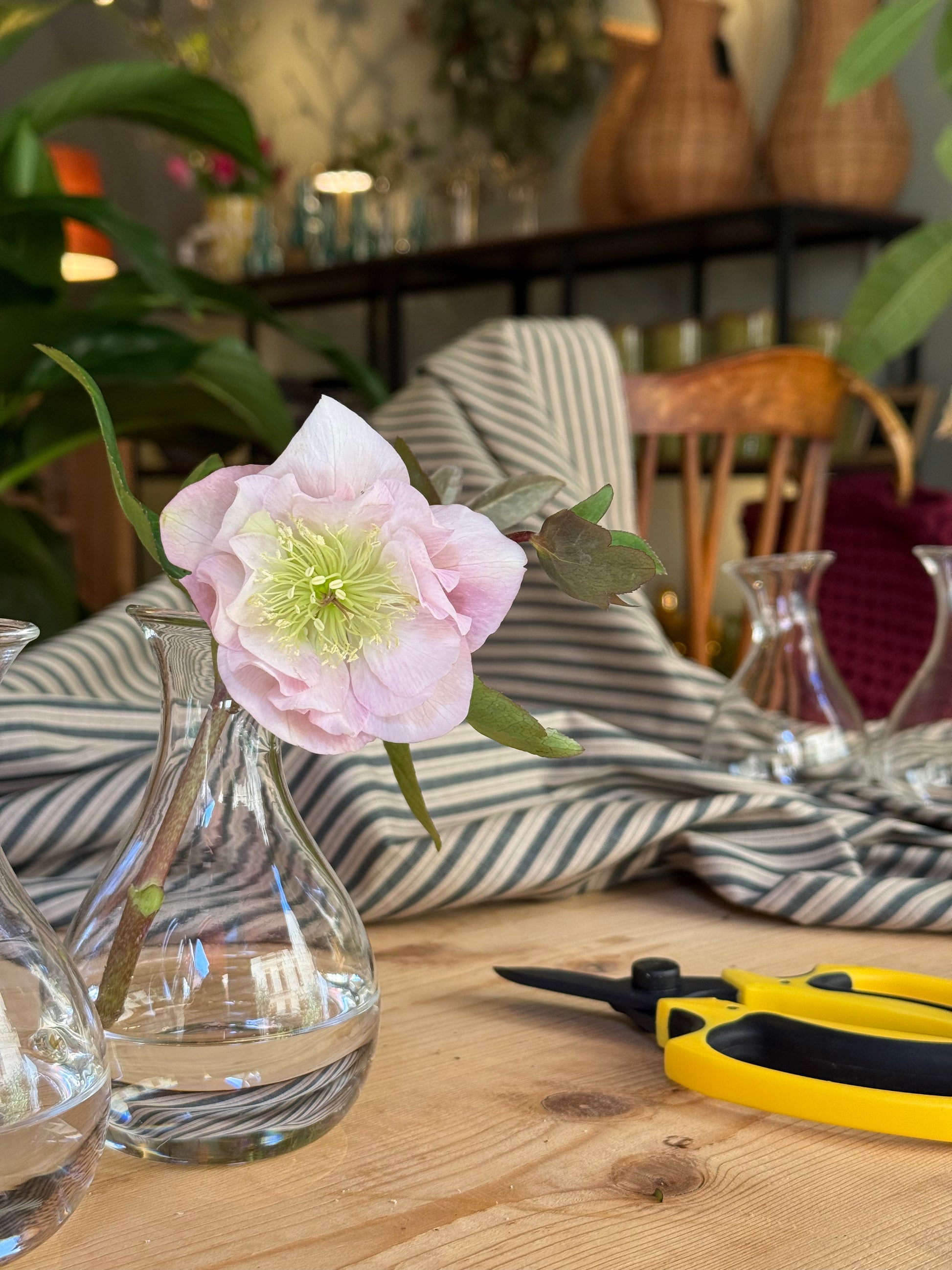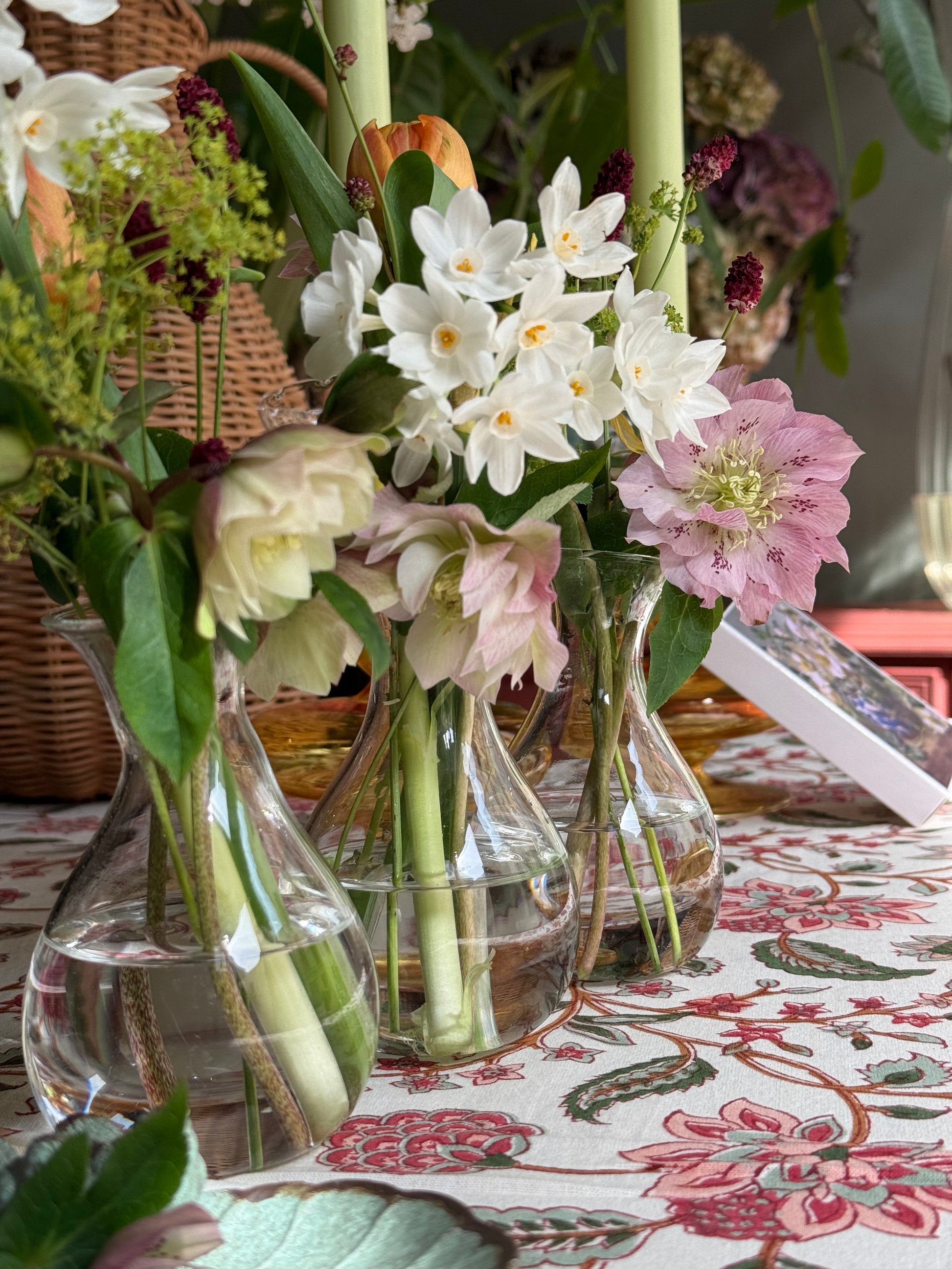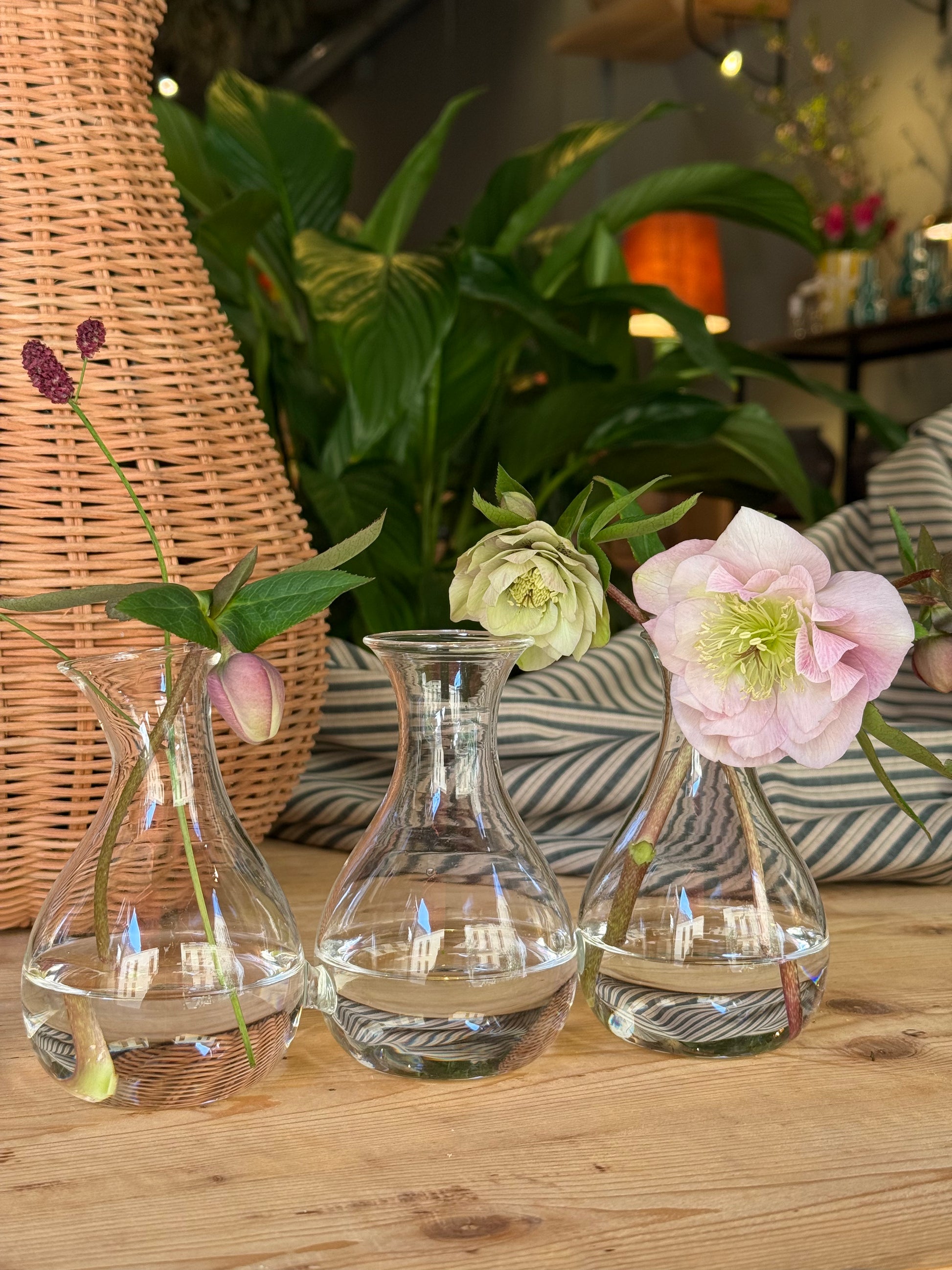 Trio de soliflores de cristal interconectados entre sí. Muy útil para crear pequeños arreglos florales y lucirlos como centro de mesa o en una estantería. Divertido y fácil de usar.